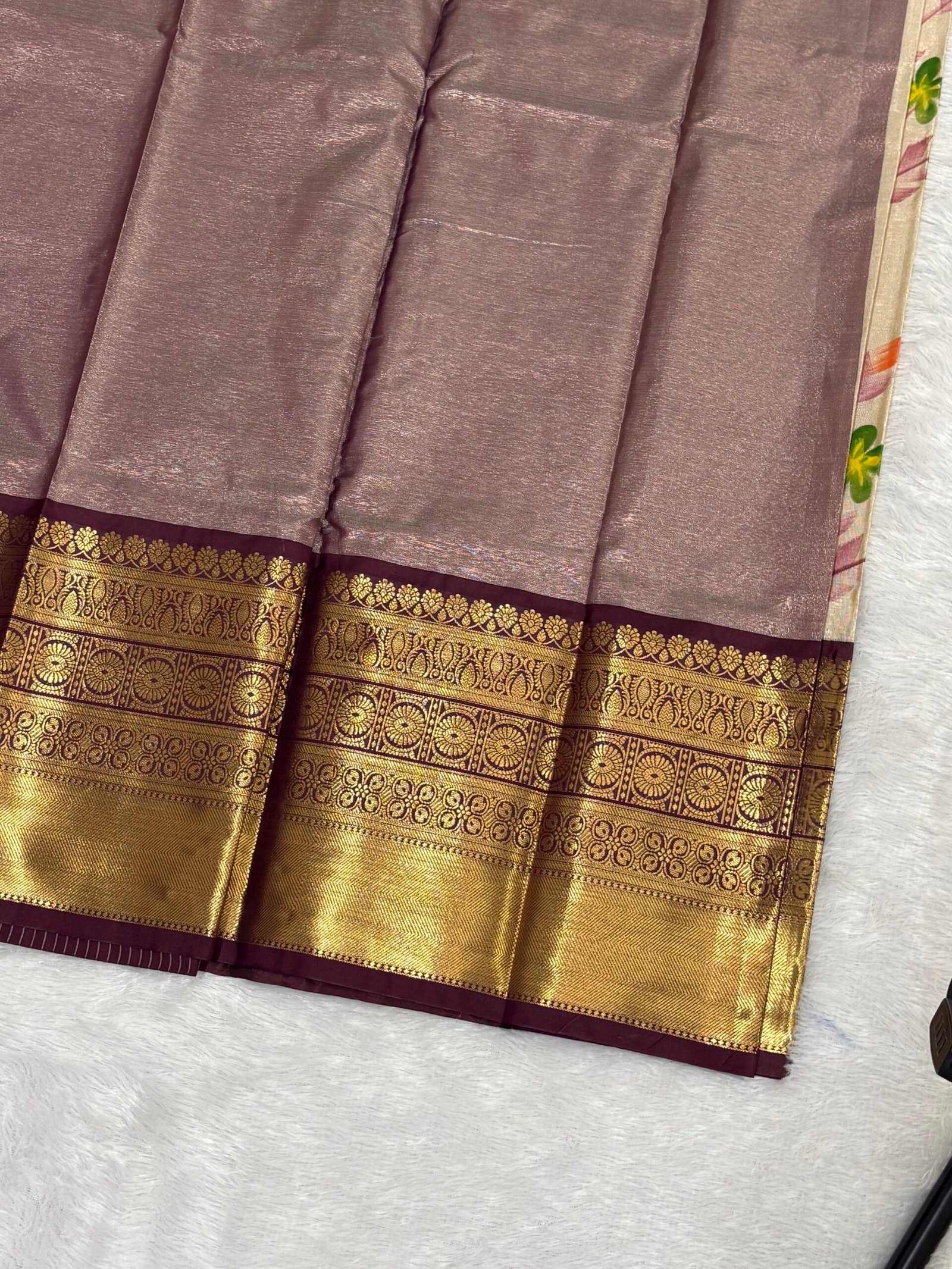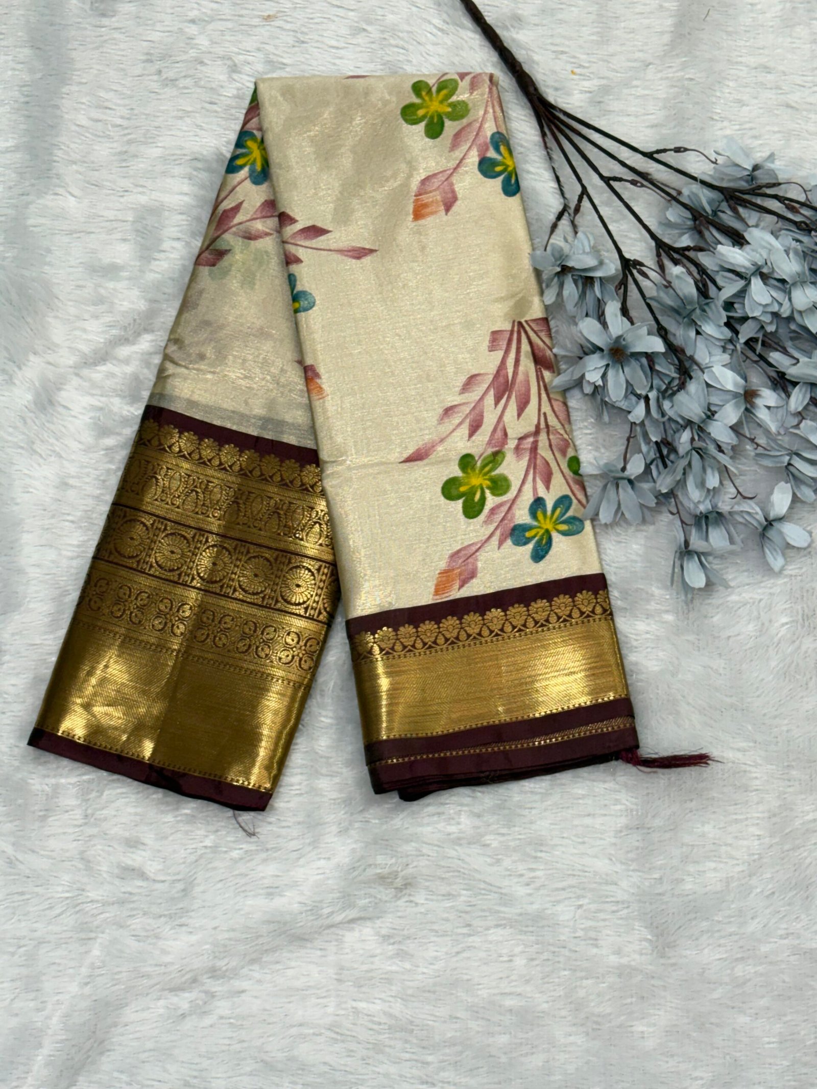 Grace meets craftsmanship in this exquisite brush-painted Banarasi tissue silk Kanchivaram saree, designed for women who appreciate timeless elegance with an artistic touch. The luminous tissue silk fabric offers a subtle golden glow, beautifully enhanced with hand-inspired brush painted floral motifs that bring vibrant colour and graceful movement across the saree.