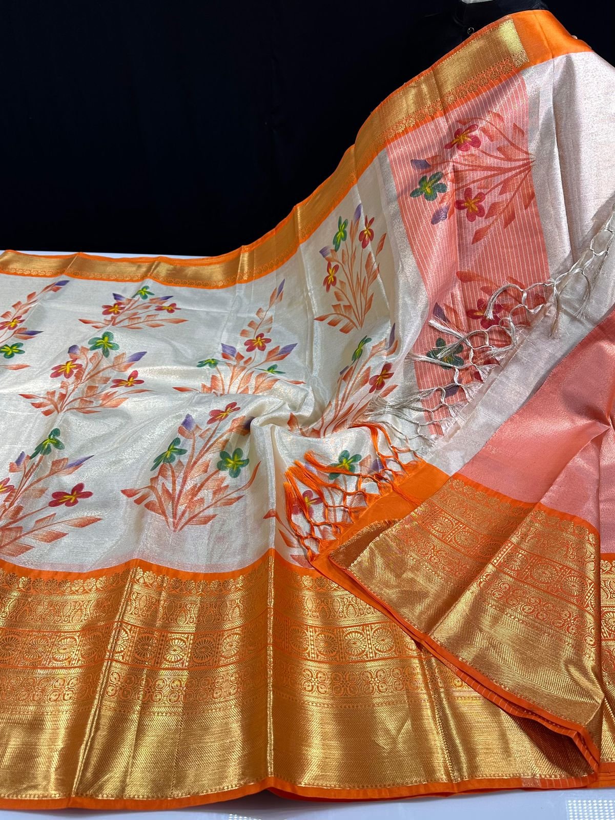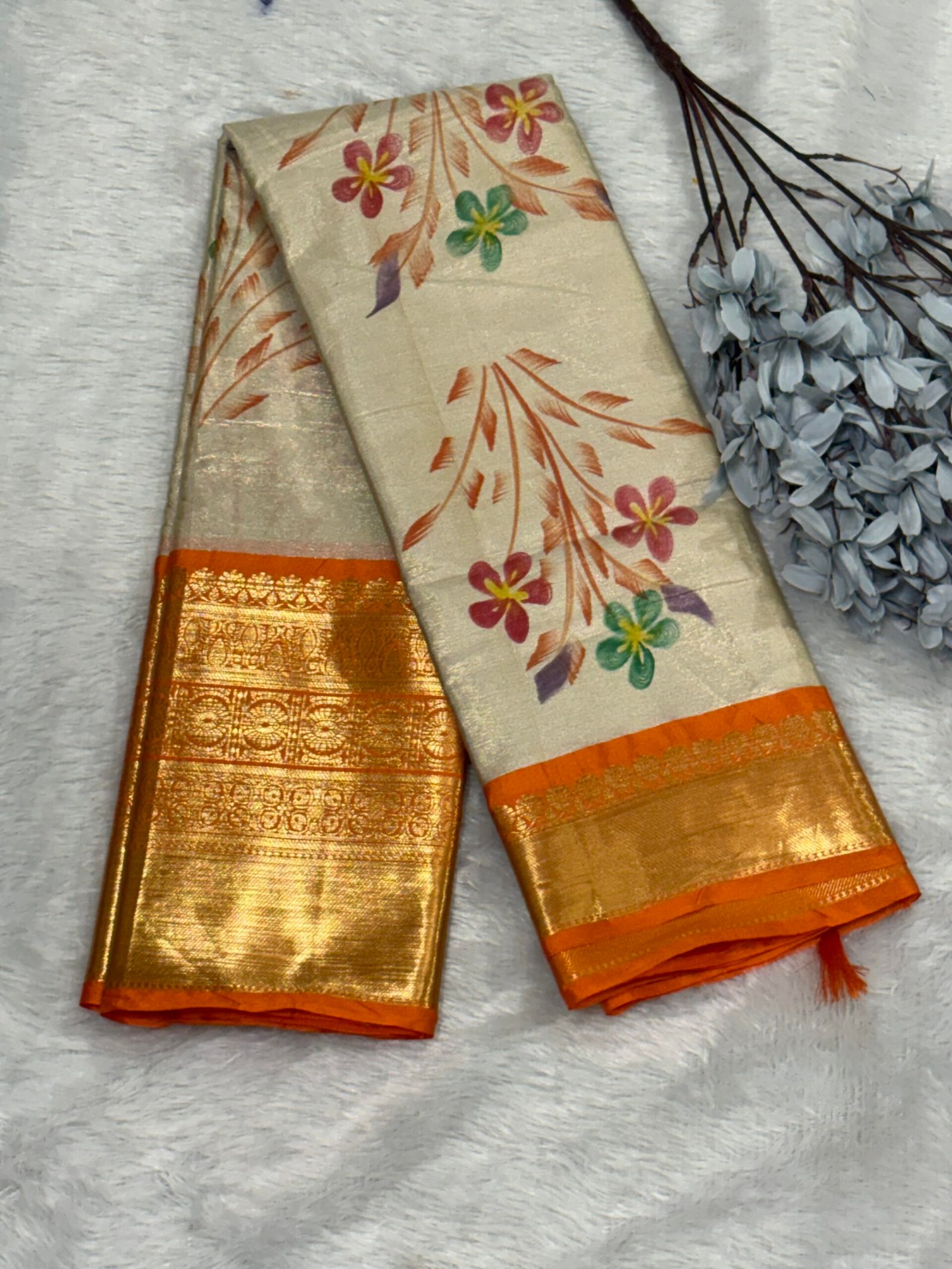 Grace meets craftsmanship in this exquisite brush-painted Banarasi tissue silk Kanchivaram saree, designed for women who appreciate timeless elegance with an artistic touch. The luminous tissue silk fabric offers a subtle golden glow, beautifully enhanced with hand-inspired brush painted floral motifs that bring vibrant colour and graceful movement across the saree.
