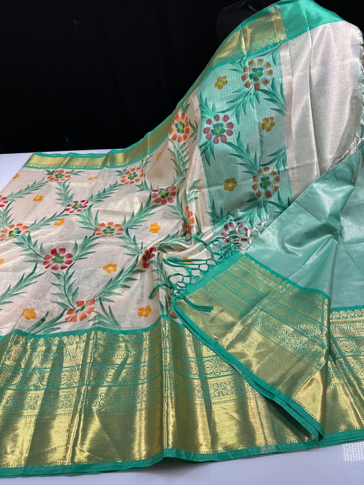 Grace meets craftsmanship in this exquisite brush-painted Banarasi tissue silk Kanchivaram saree, designed for women who appreciate timeless elegance with an artistic touch. The luminous tissue silk fabric offers a subtle golden glow, beautifully enhanced with hand-inspired brush painted floral motifs that bring vibrant colour and graceful movement across the saree.