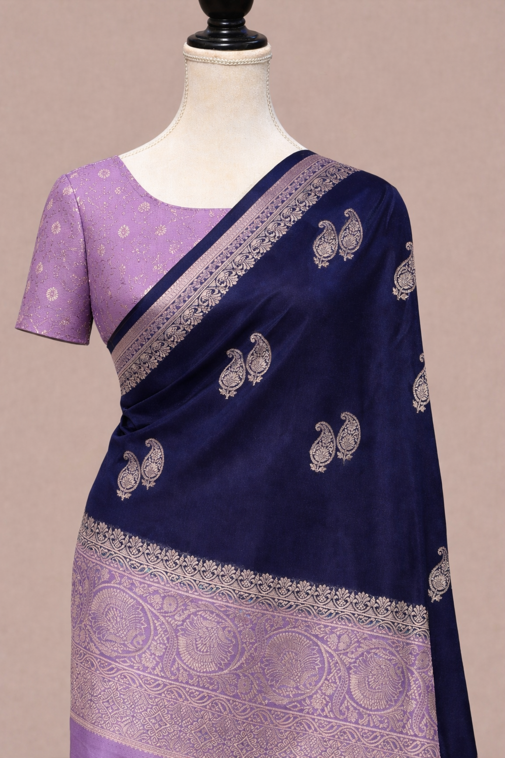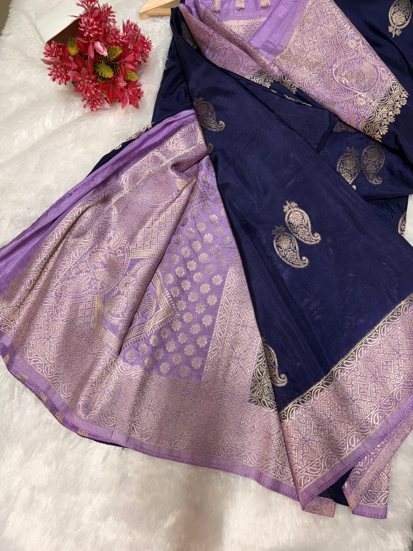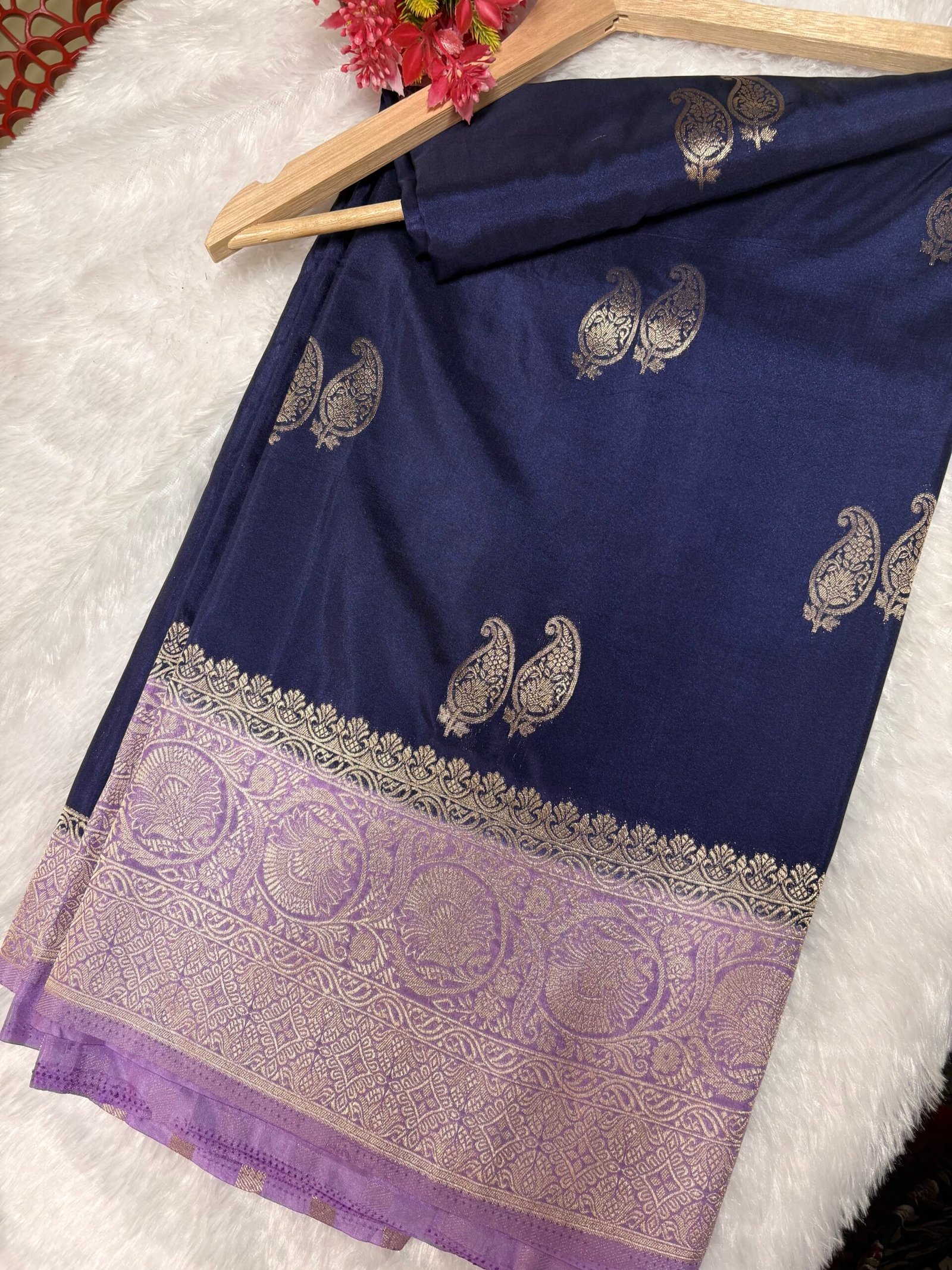 - Border: Rich navy blue contrast border with intricate gold-silver zari weaving