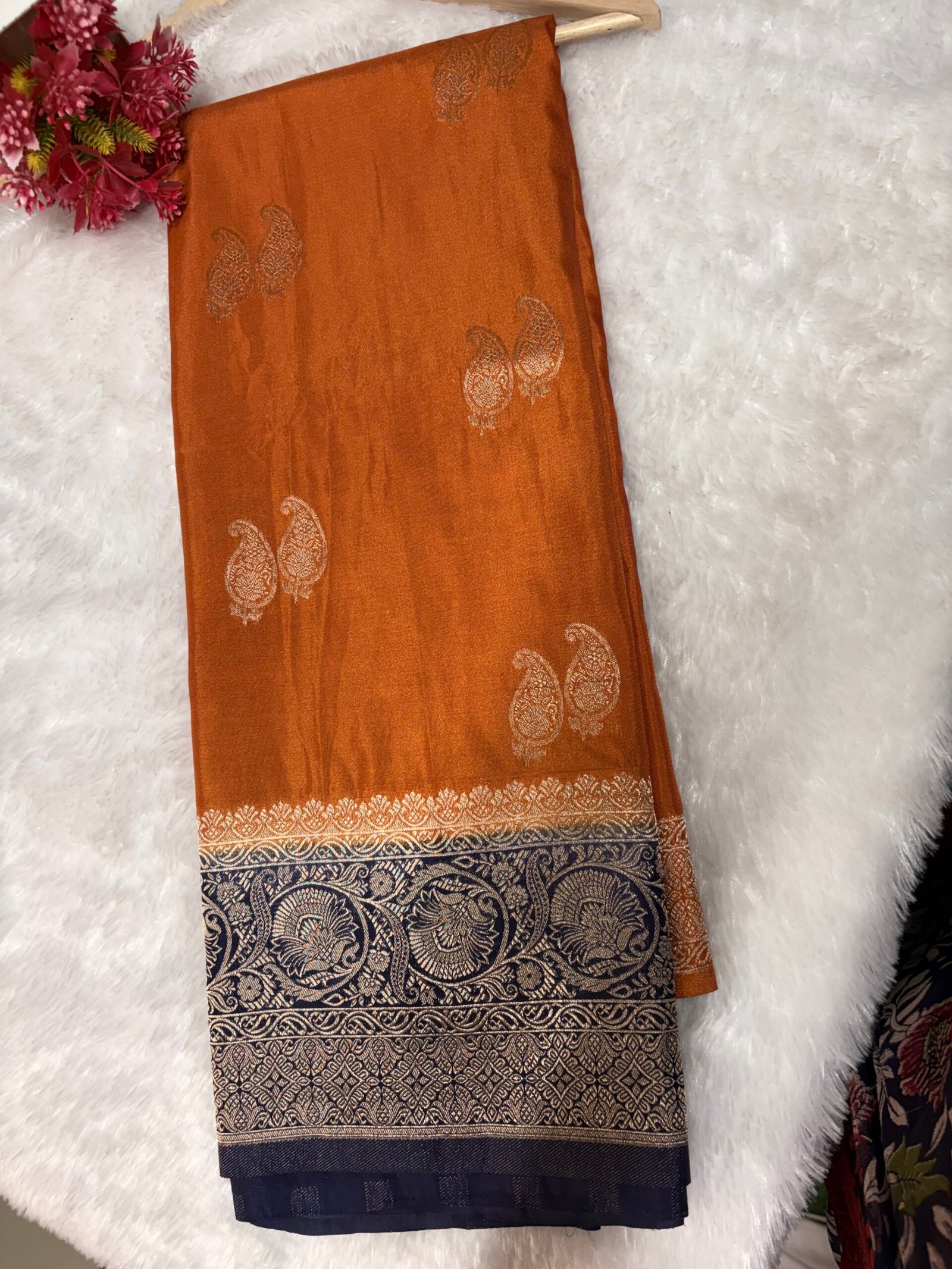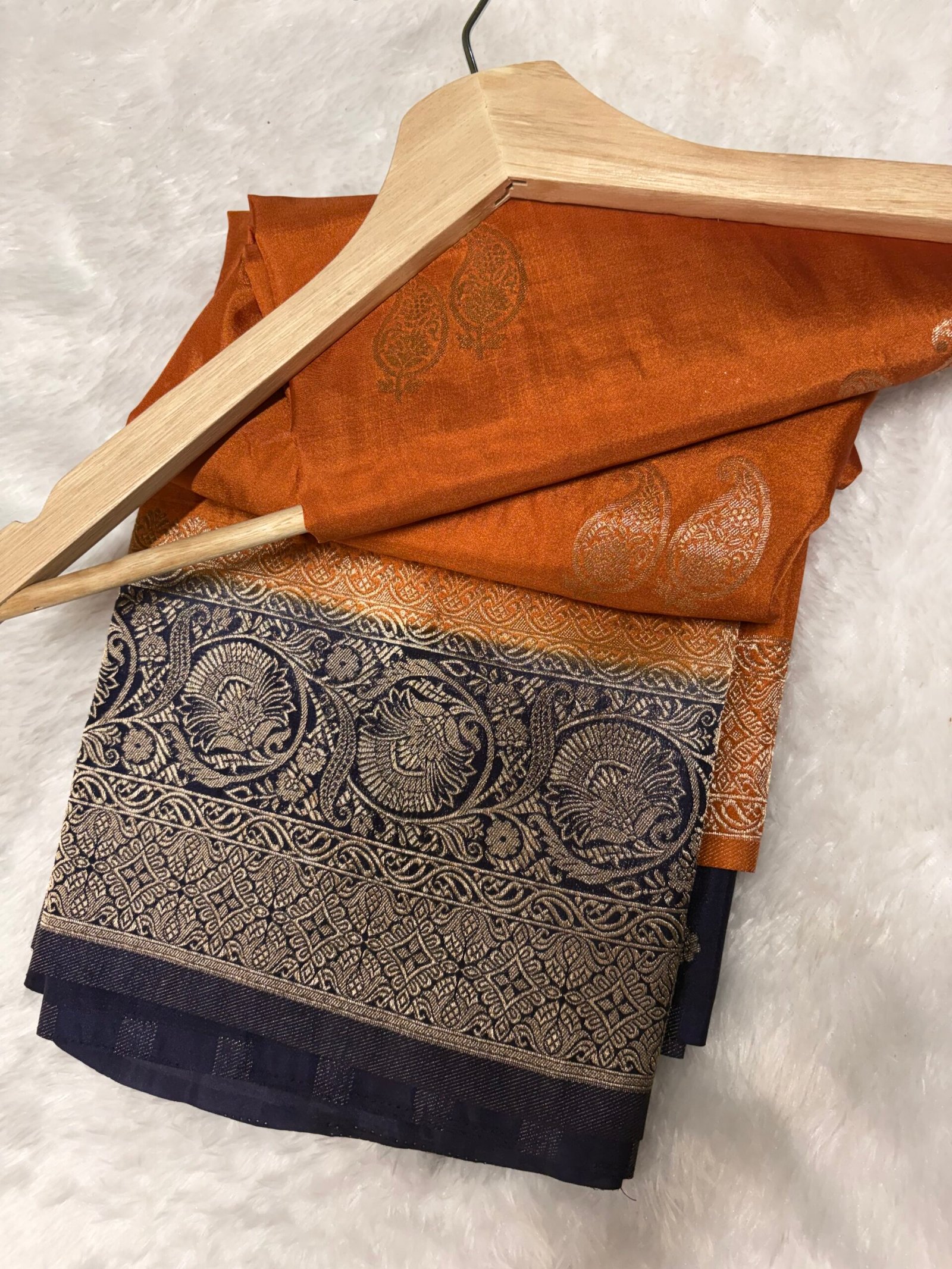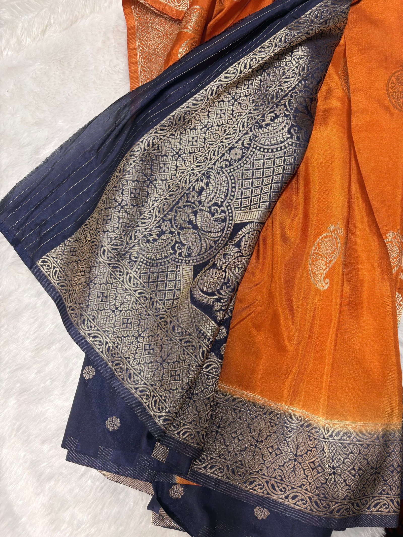The interplay of vibrant orange and classic navy, enhanced with shimmering zari, gives this saree a distinctive elegance—ideal for festive wear, weddings, and cultural celebrations.