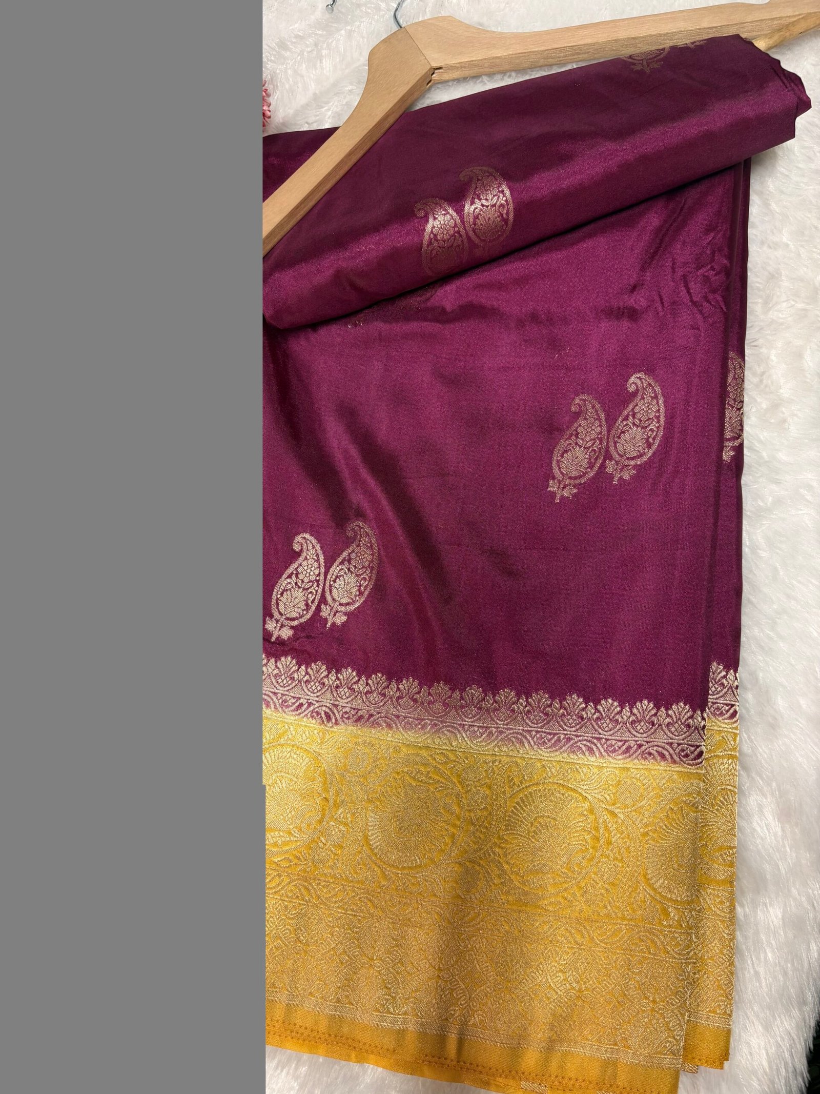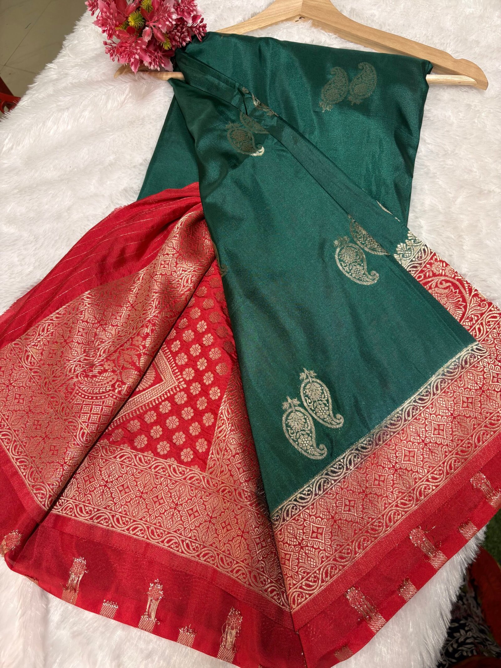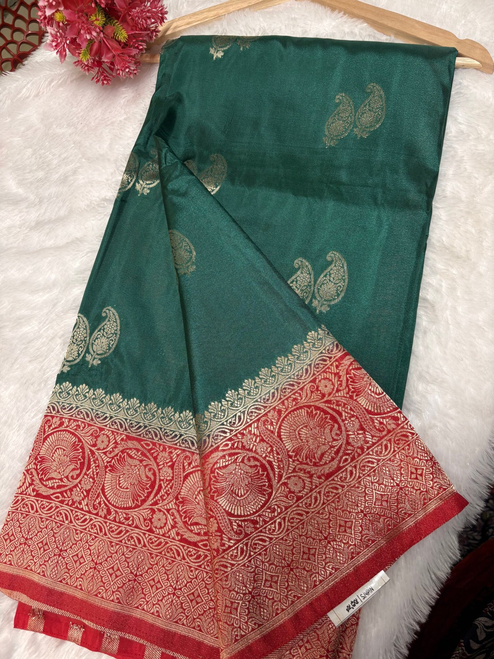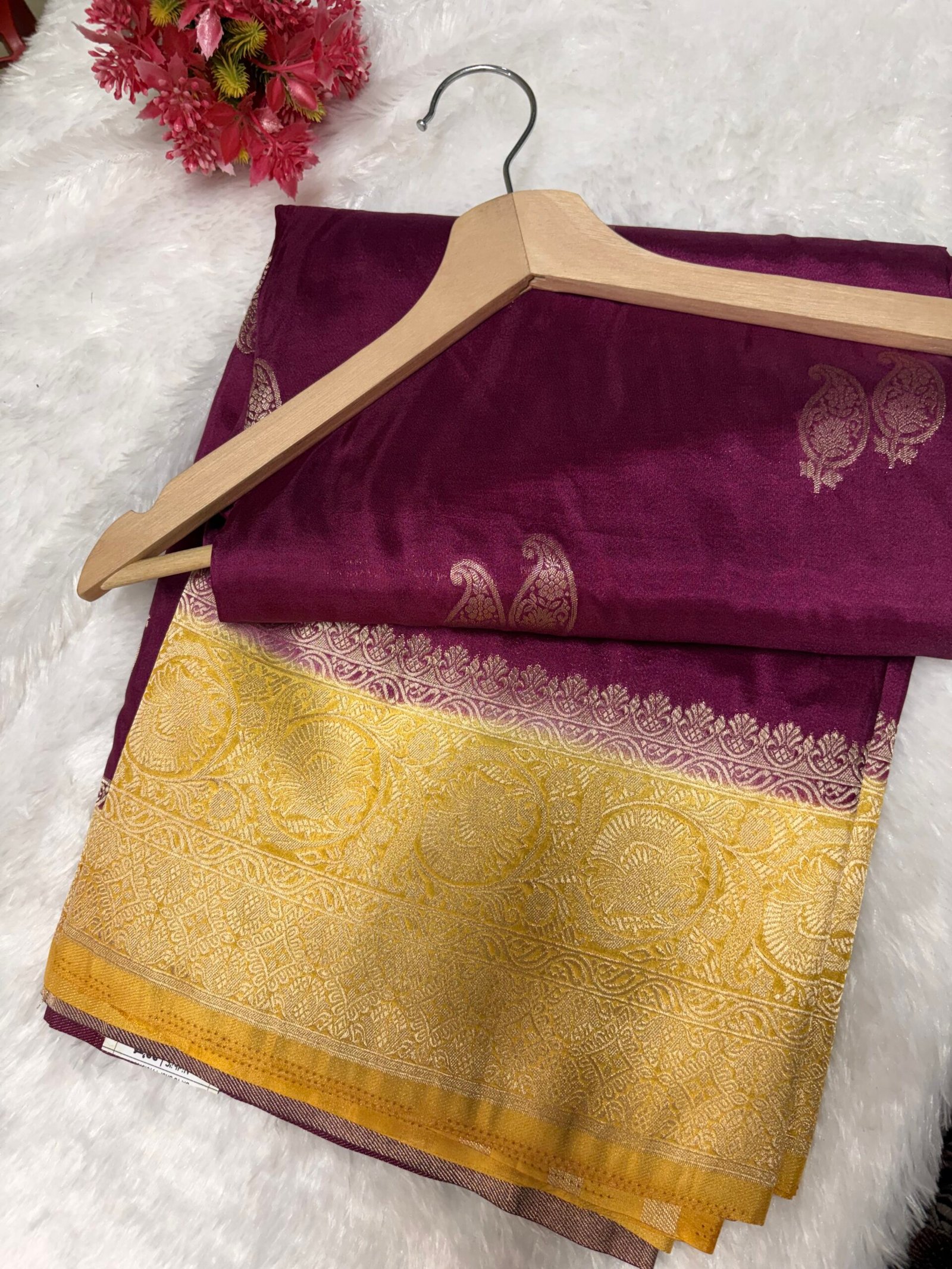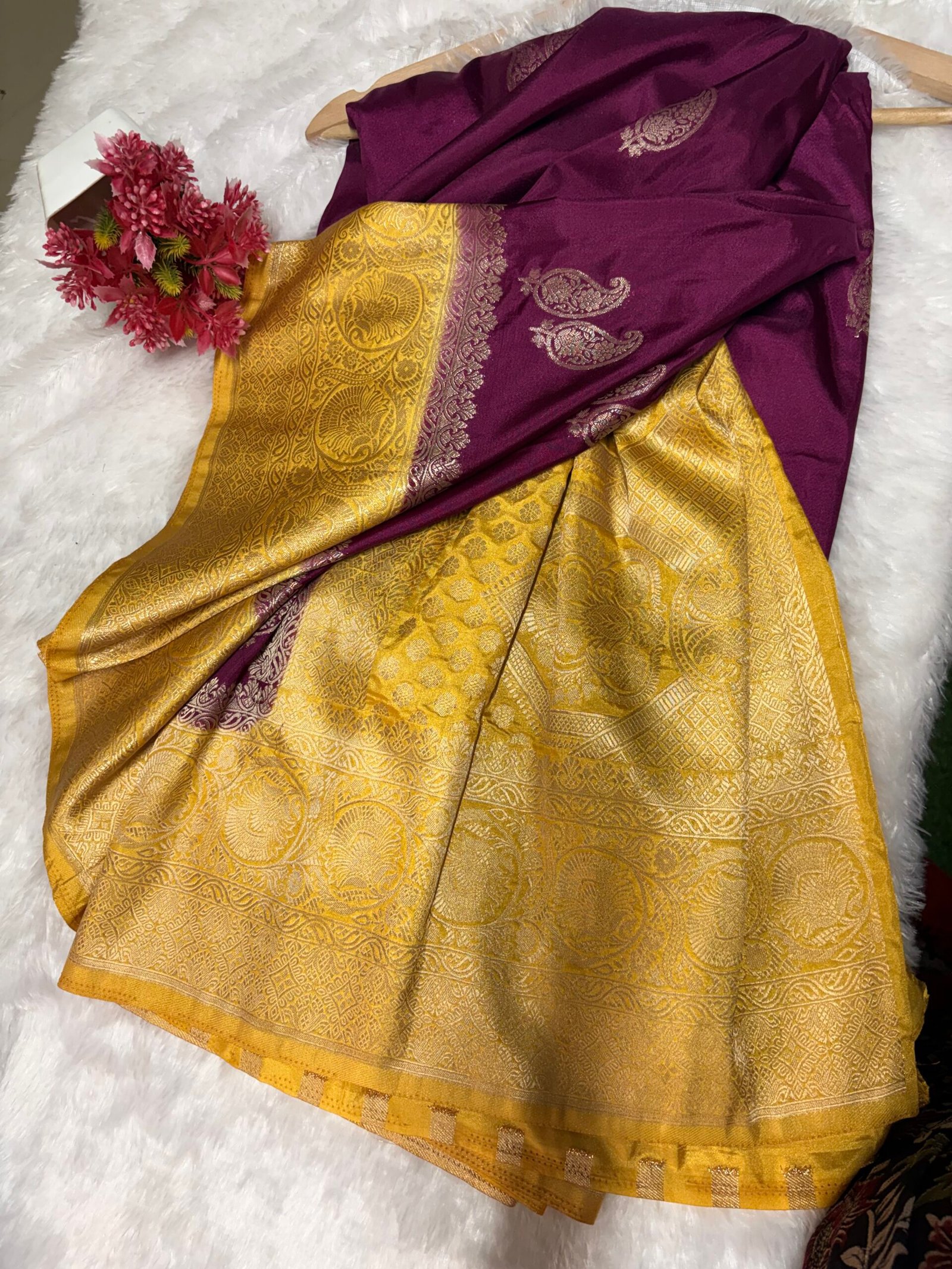 - Pallu: Heavy, detailed zari work with traditional motifs