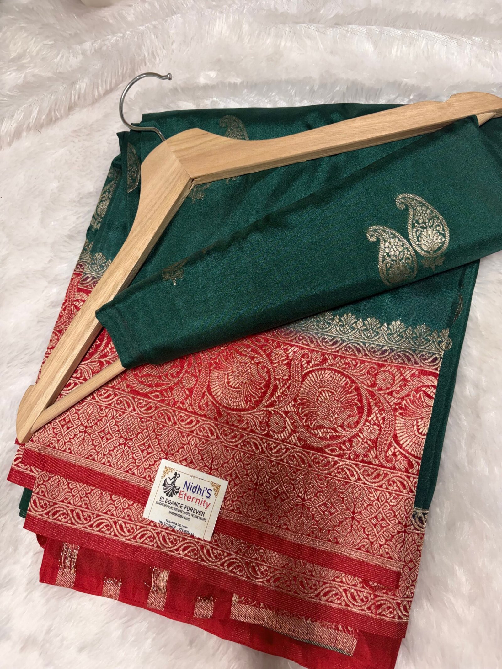 Radiating a rich colour tone, this saree is elegantly paired with a deep contrast border and blouse, creating a timeless and regal appeal. The body is kept gracefully minimal with delicate zari buttas, allowing the colour to take center stage while maintaining a refined charm.