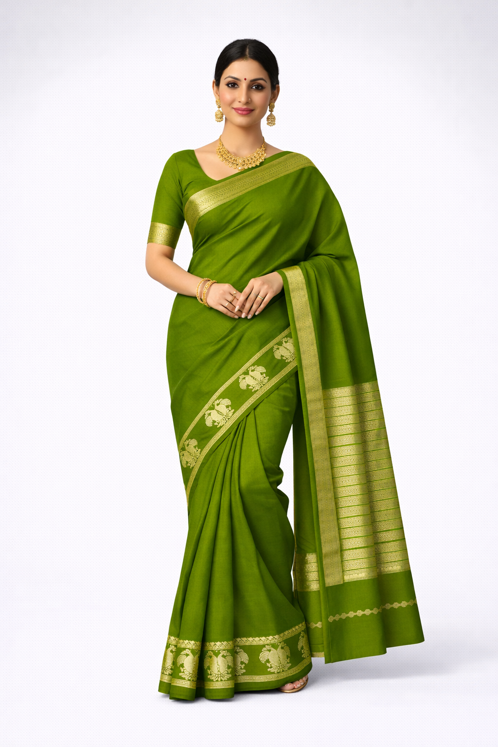 The saree features a subtle plain body that highlights its sophistication, complemented by a rich zari woven border with traditional motifs, adding a touch of heritage charm. Perfect for festive occasions, casual gatherings, or elegant day wear.