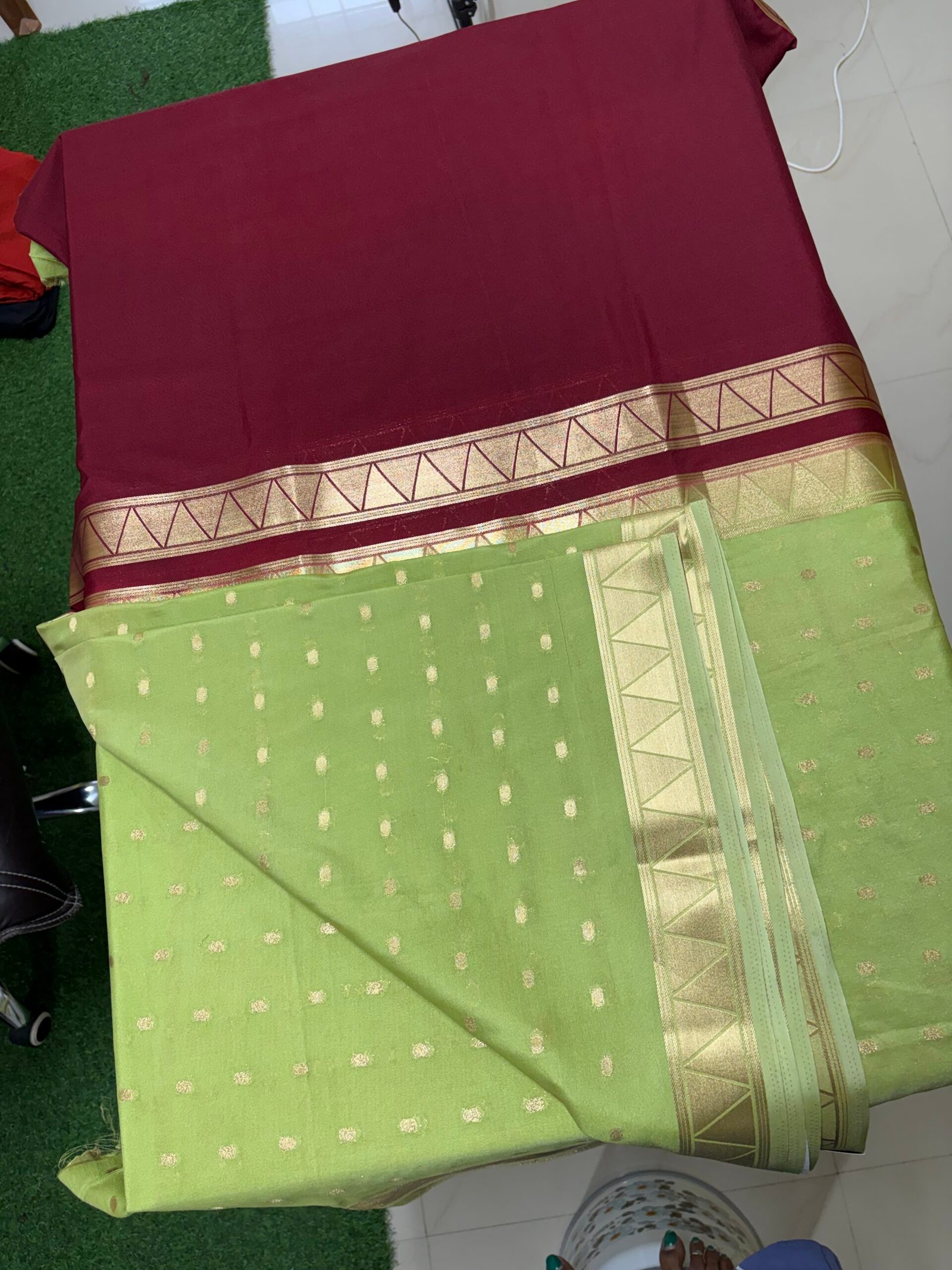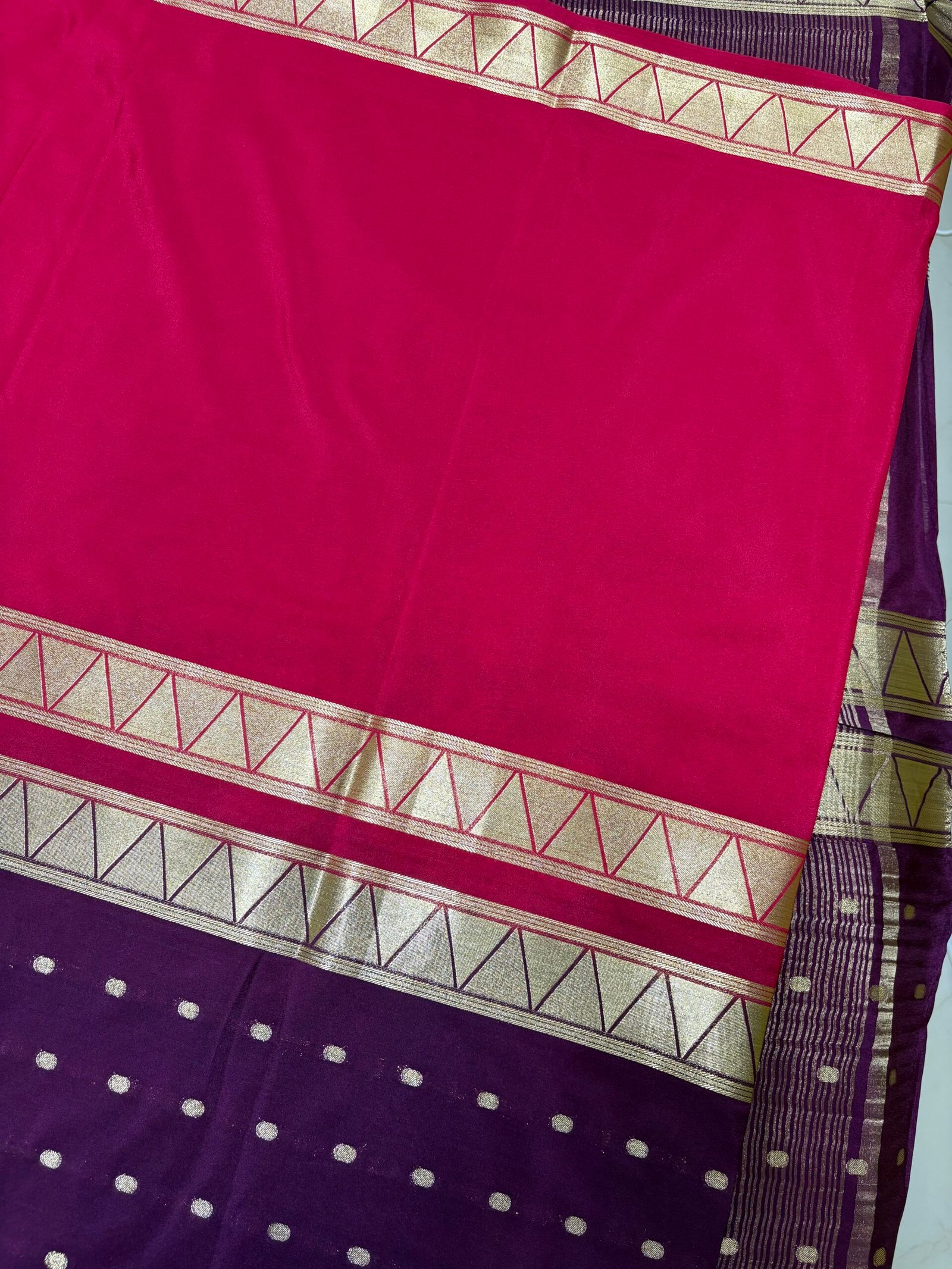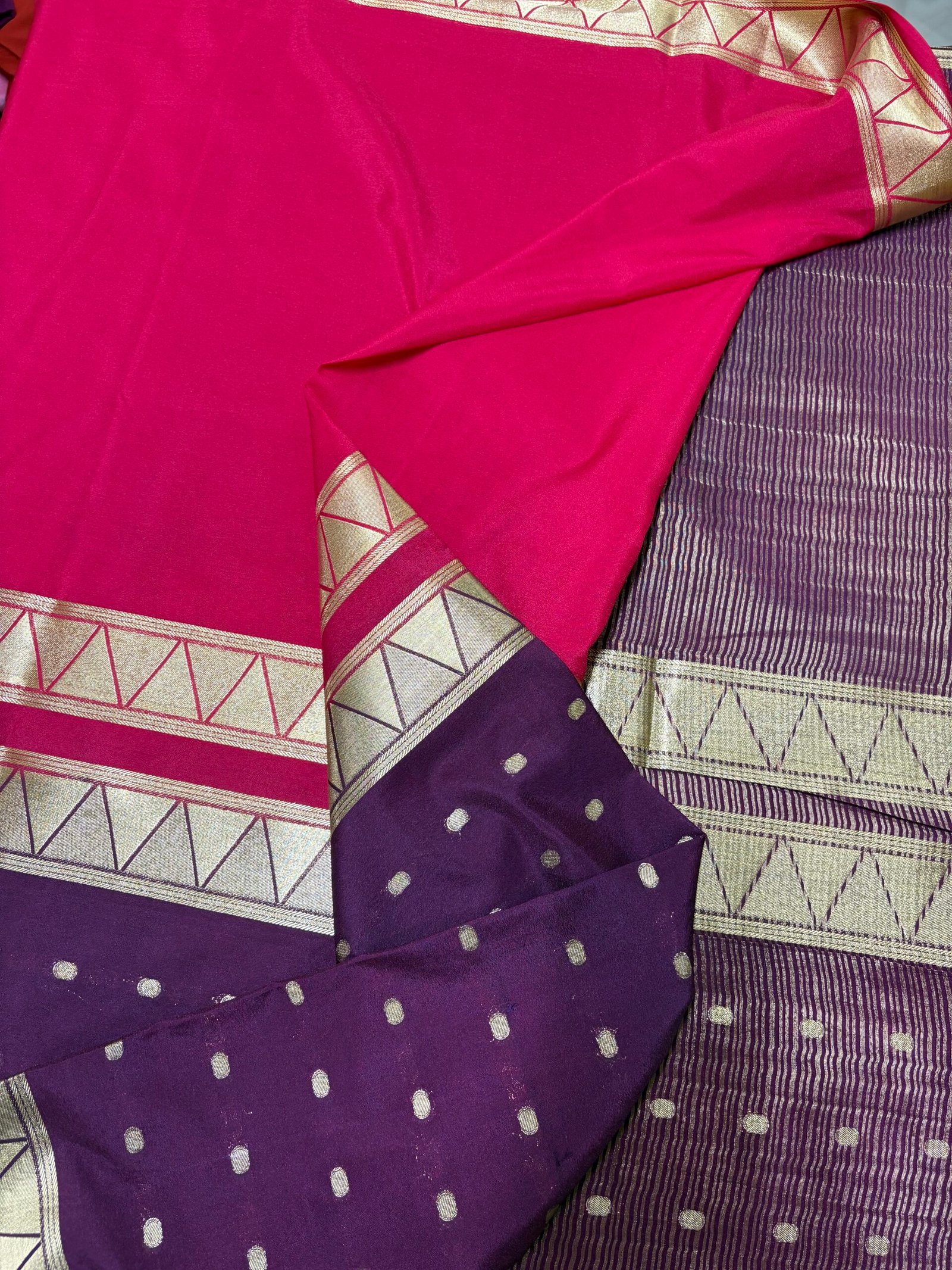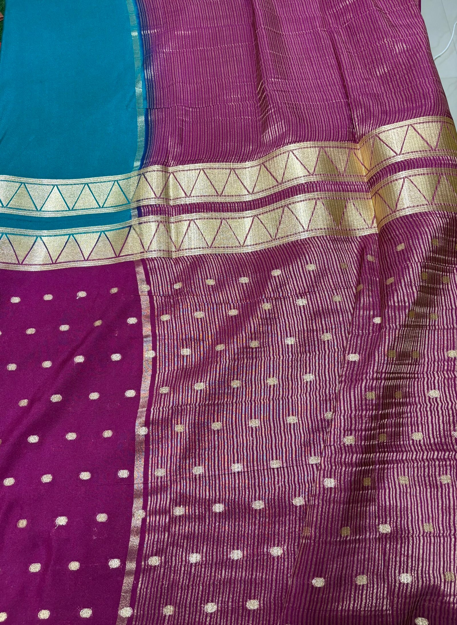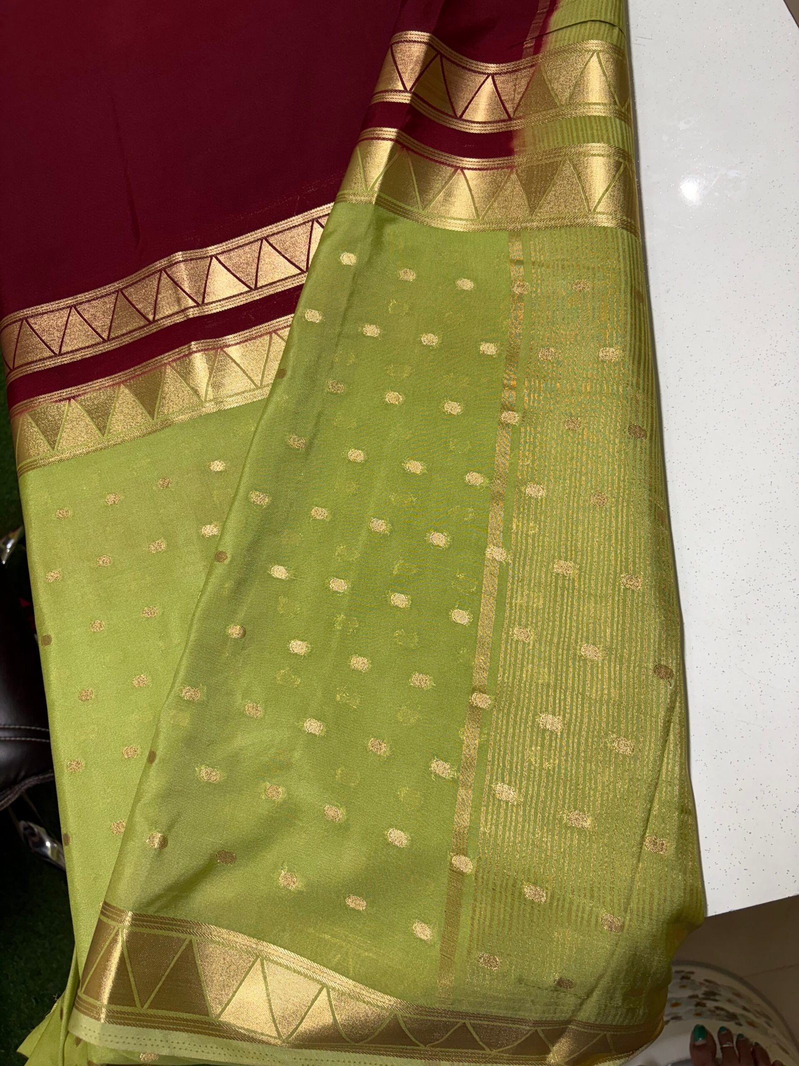 - Design: half and half saree with geometrical golden zari borders with golden zari butas