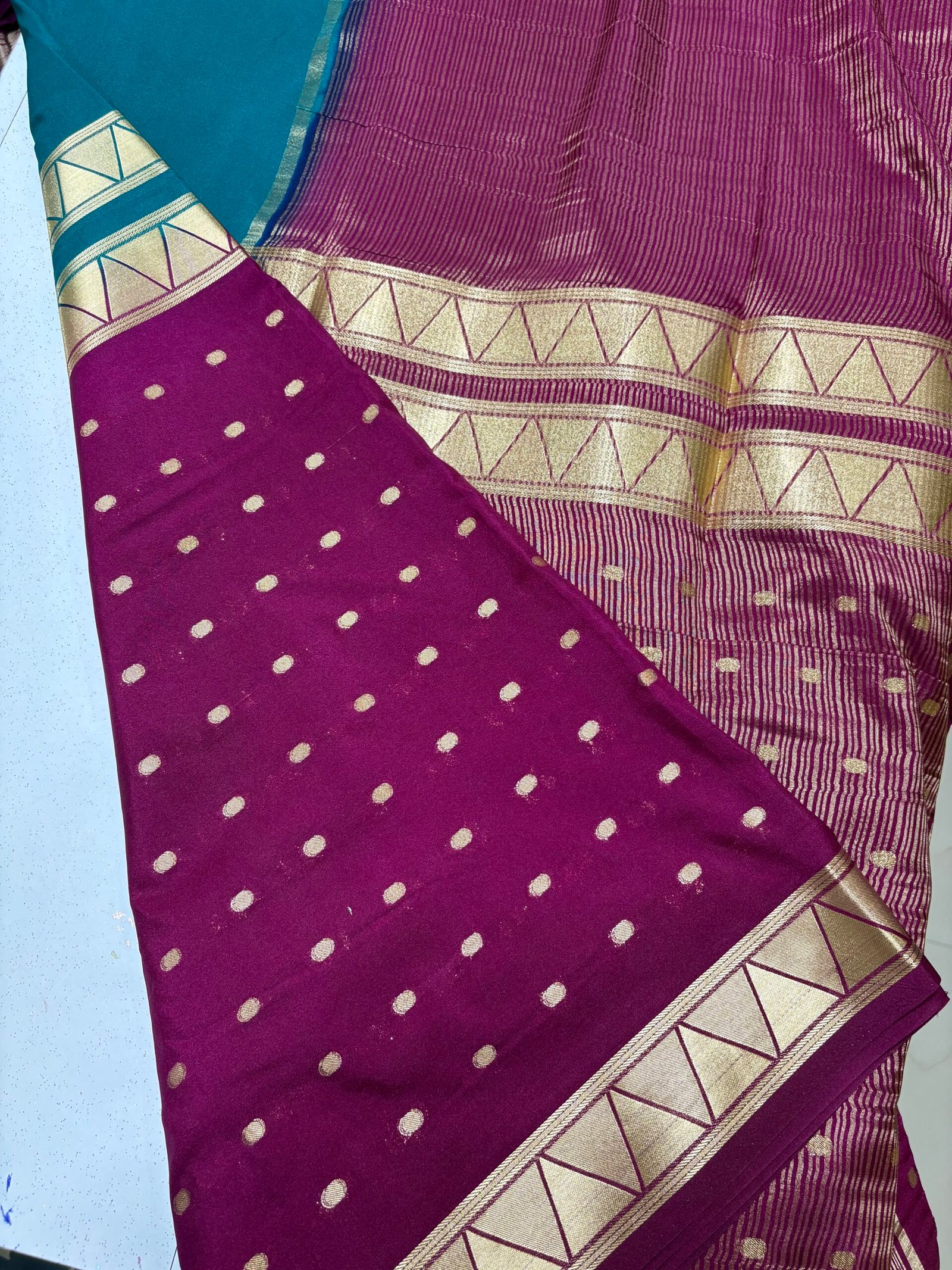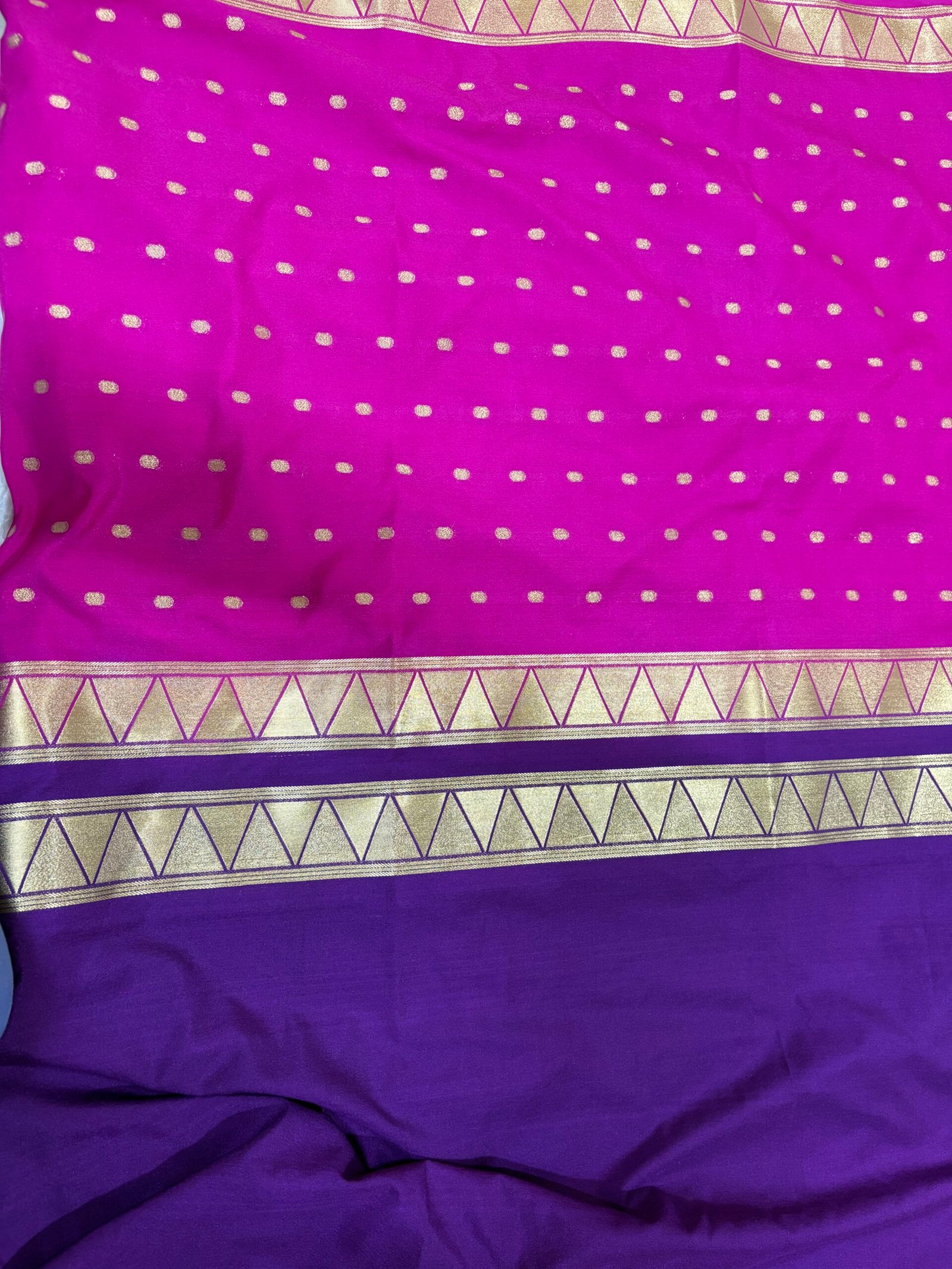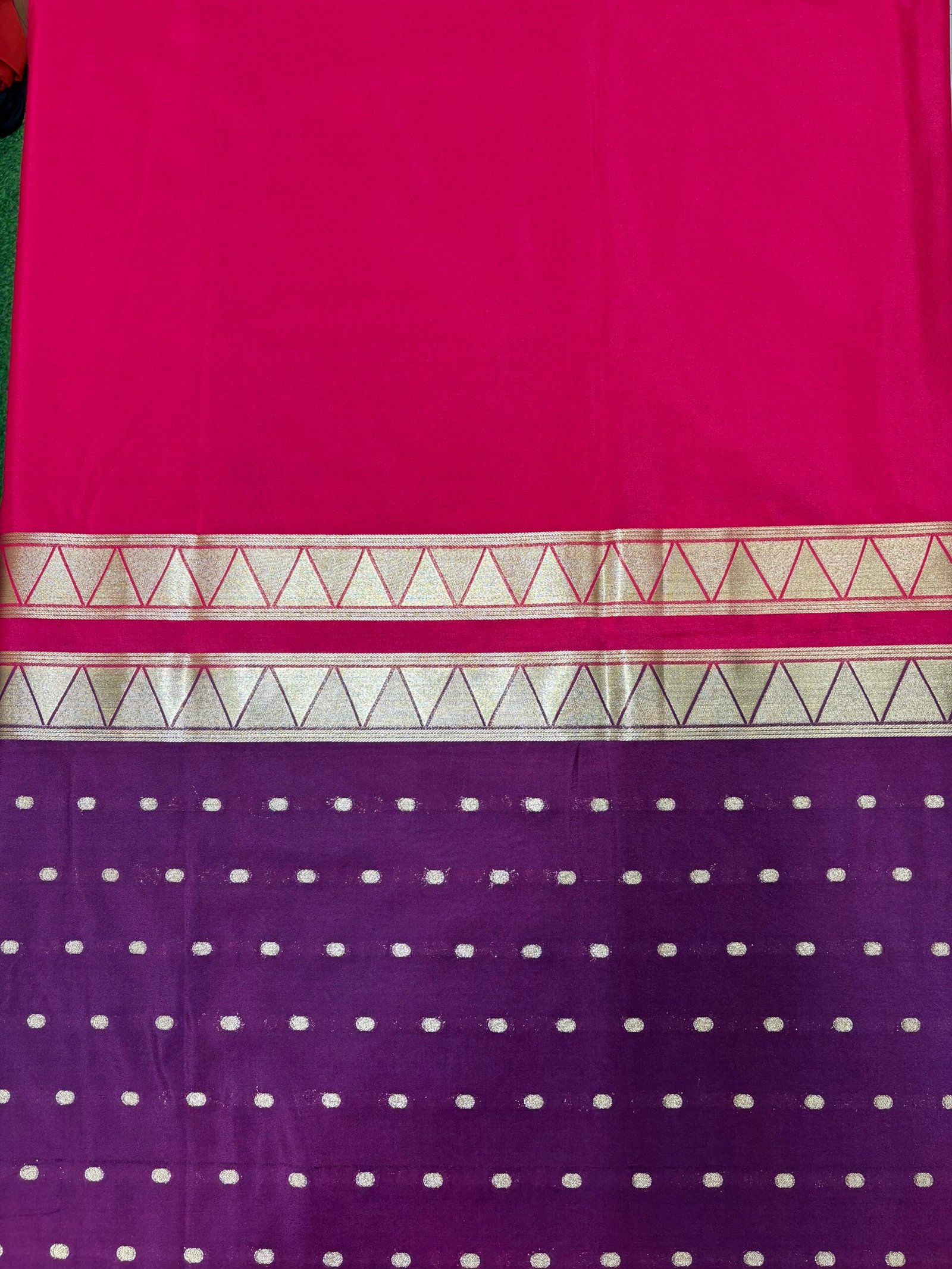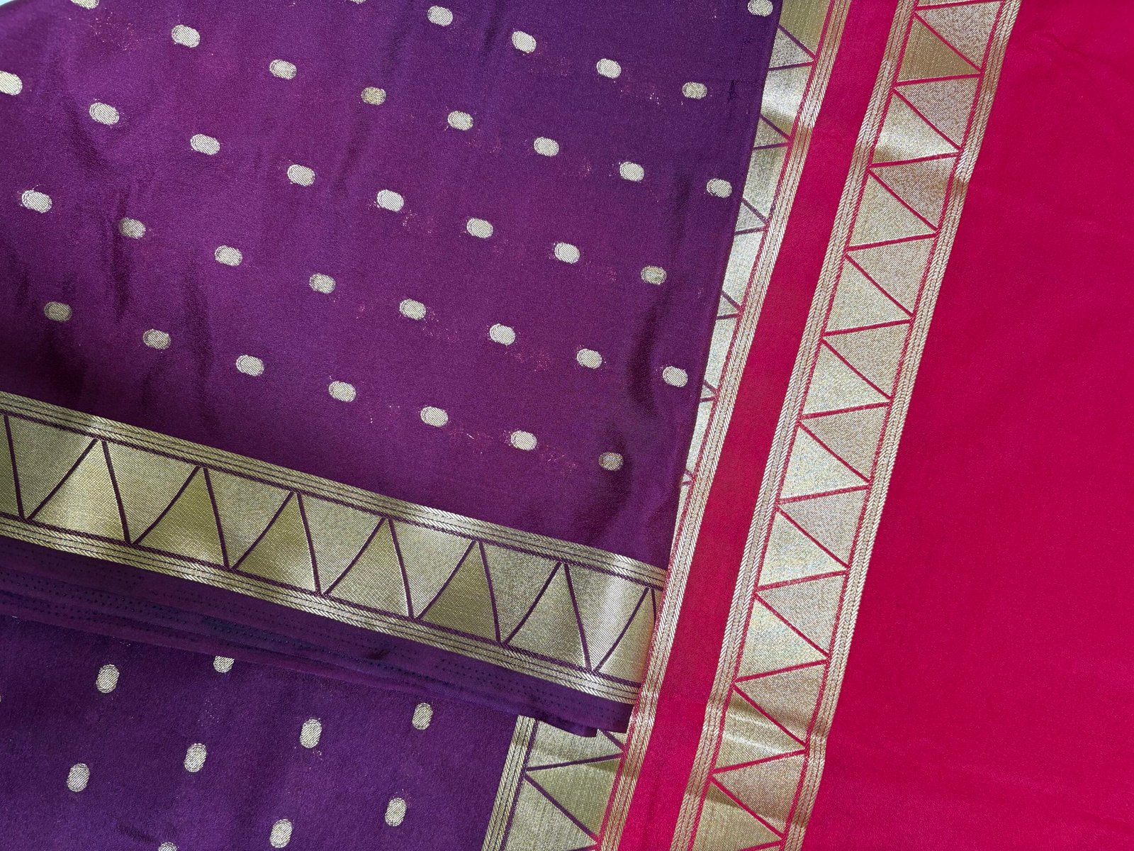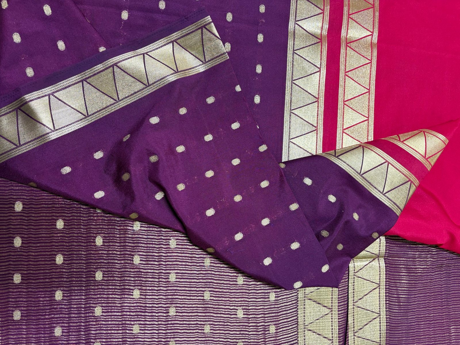 - Design: half and half saree with geometrical golden zari borders with golden zari butas