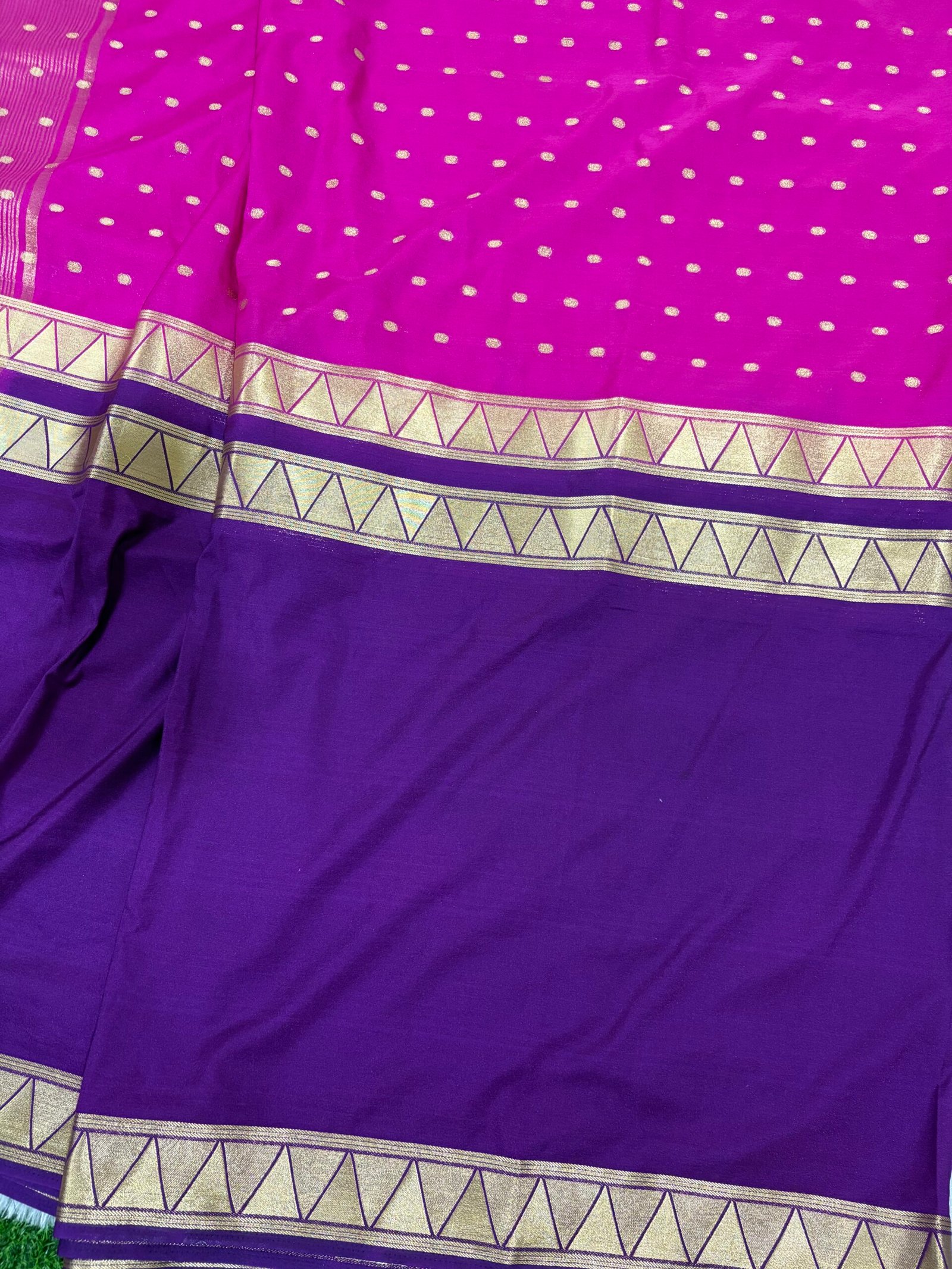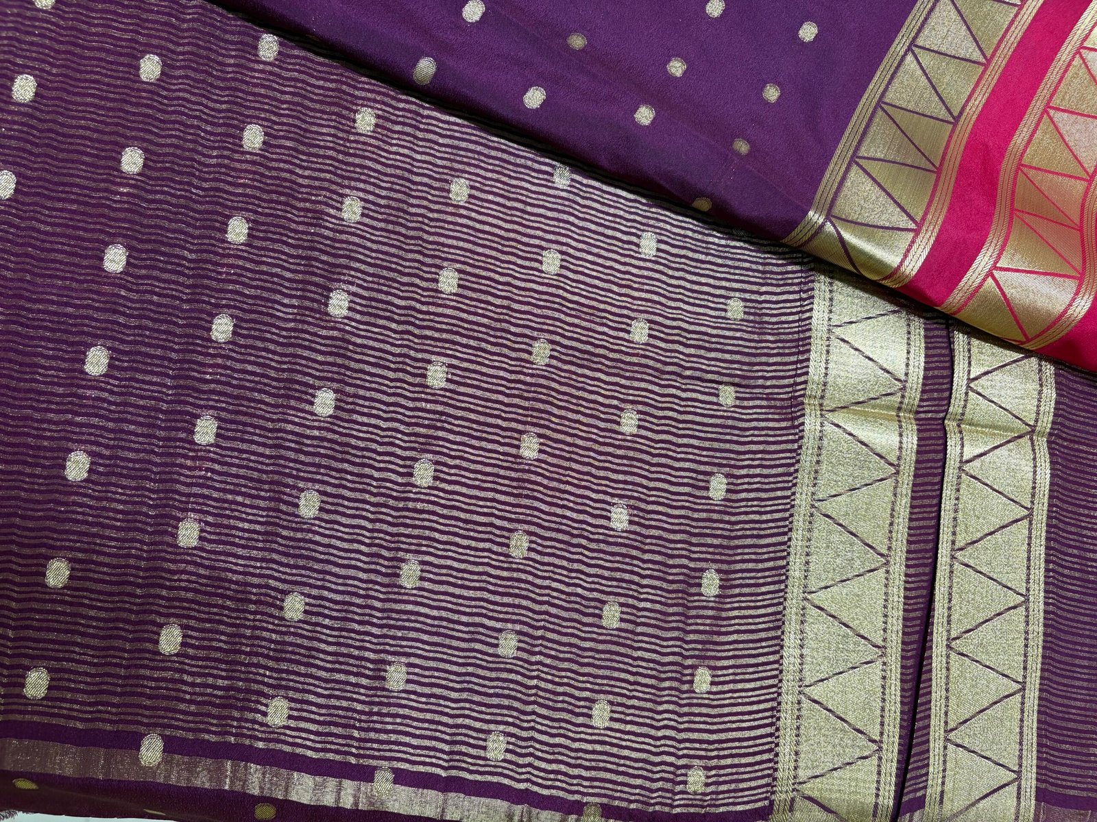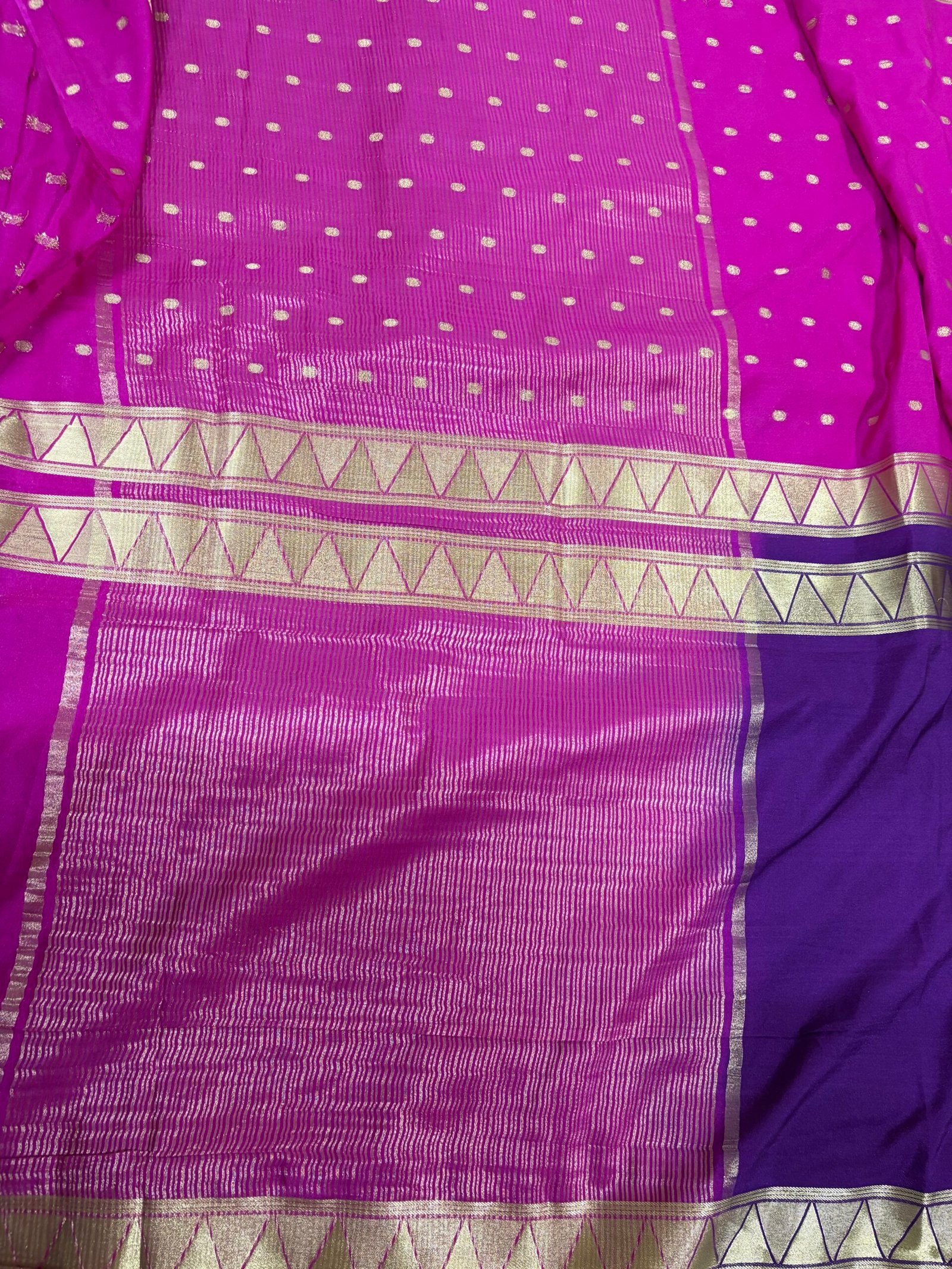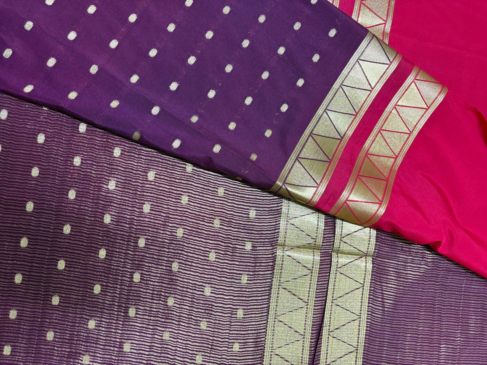 - Design: half and half saree with geometrical golden zari borders with golden zari butas
