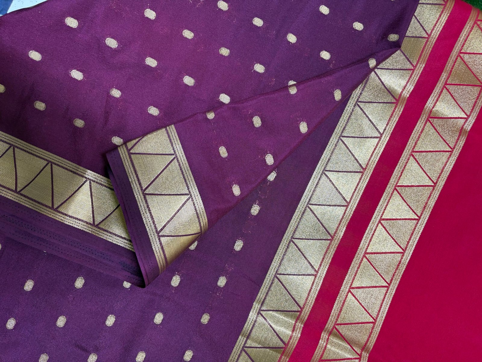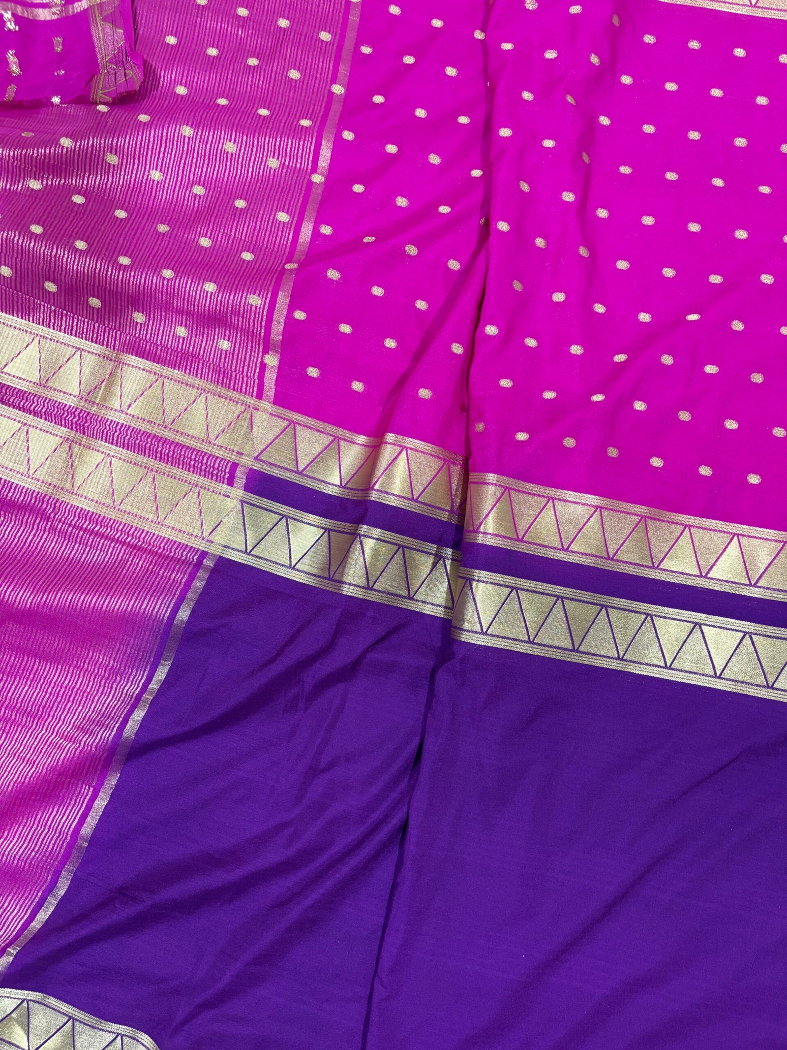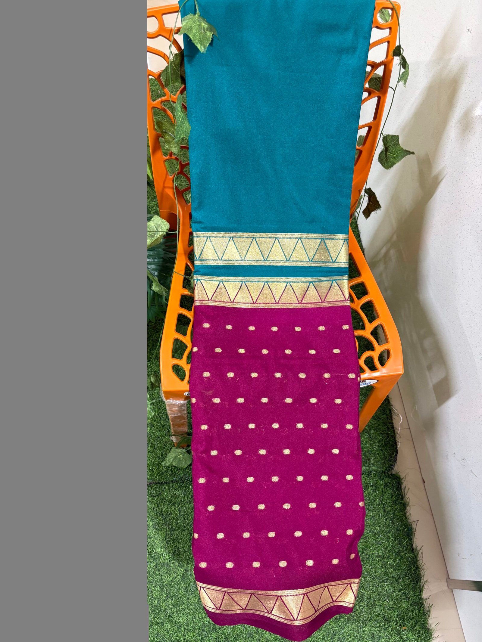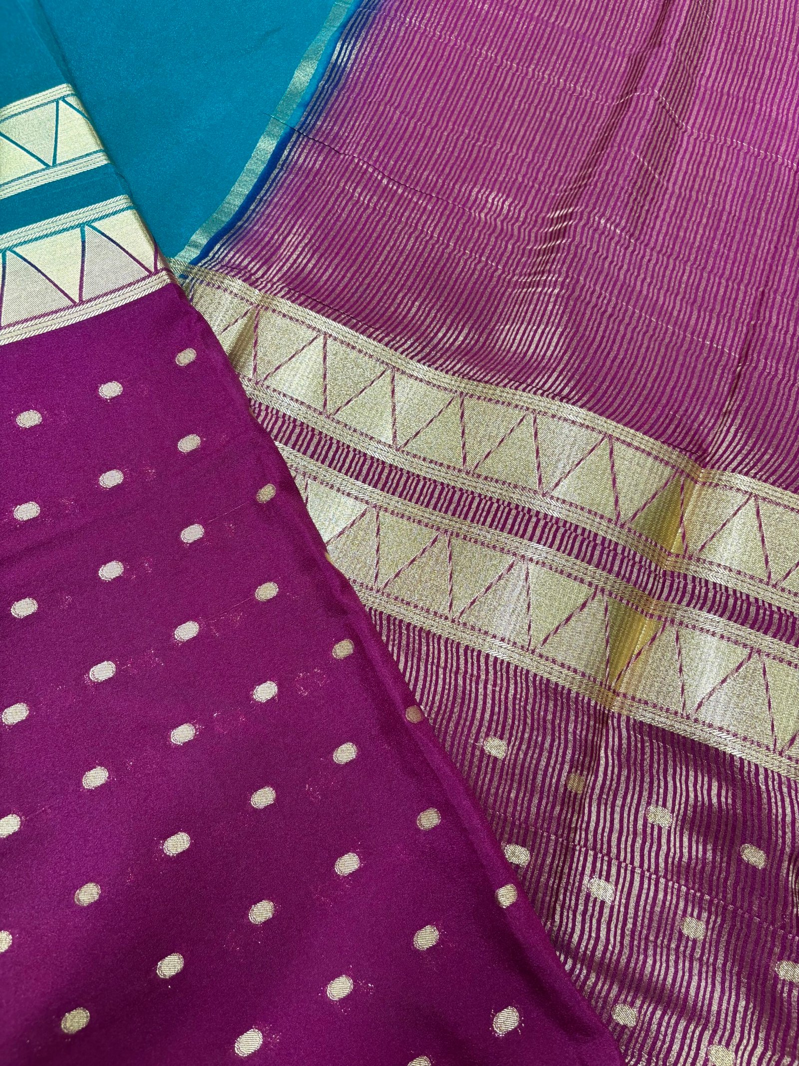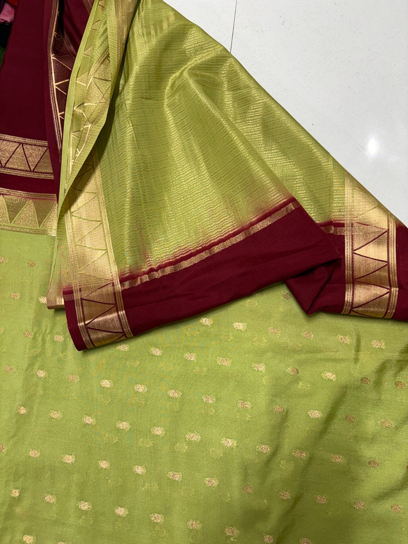 - Design: half and half saree with geometrical golden zari borders with golden zari butas