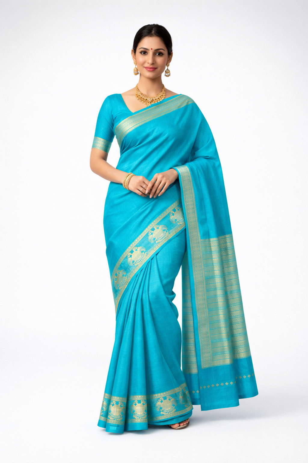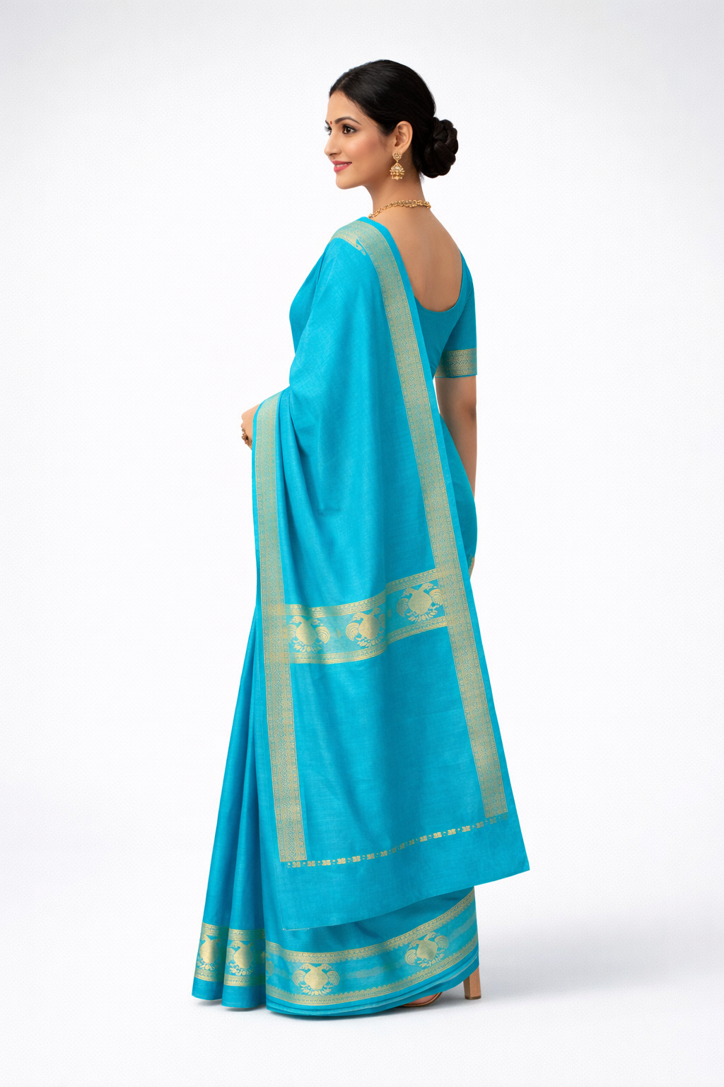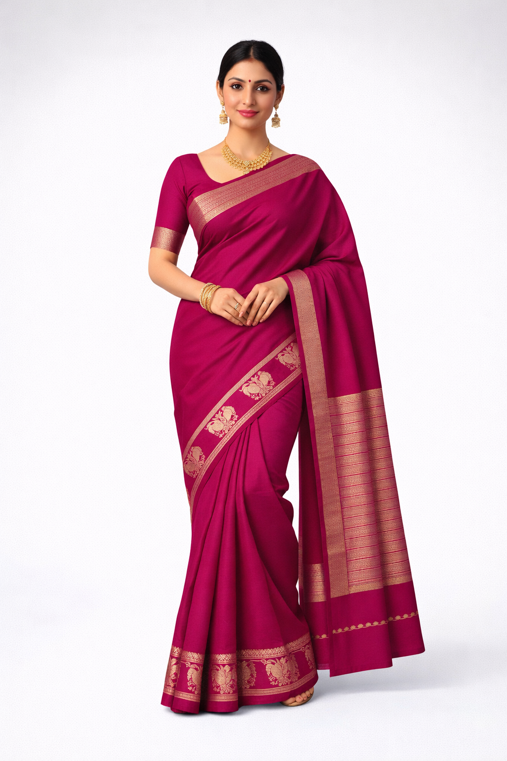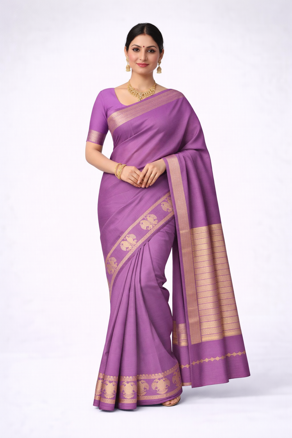 The saree features a subtle plain body that highlights its sophistication, complemented by a rich zari woven border with traditional motifs, adding a touch of heritage charm. Perfect for festive occasions, casual gatherings, or elegant day wear.