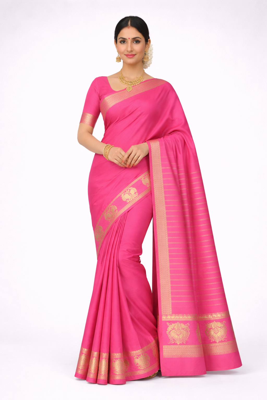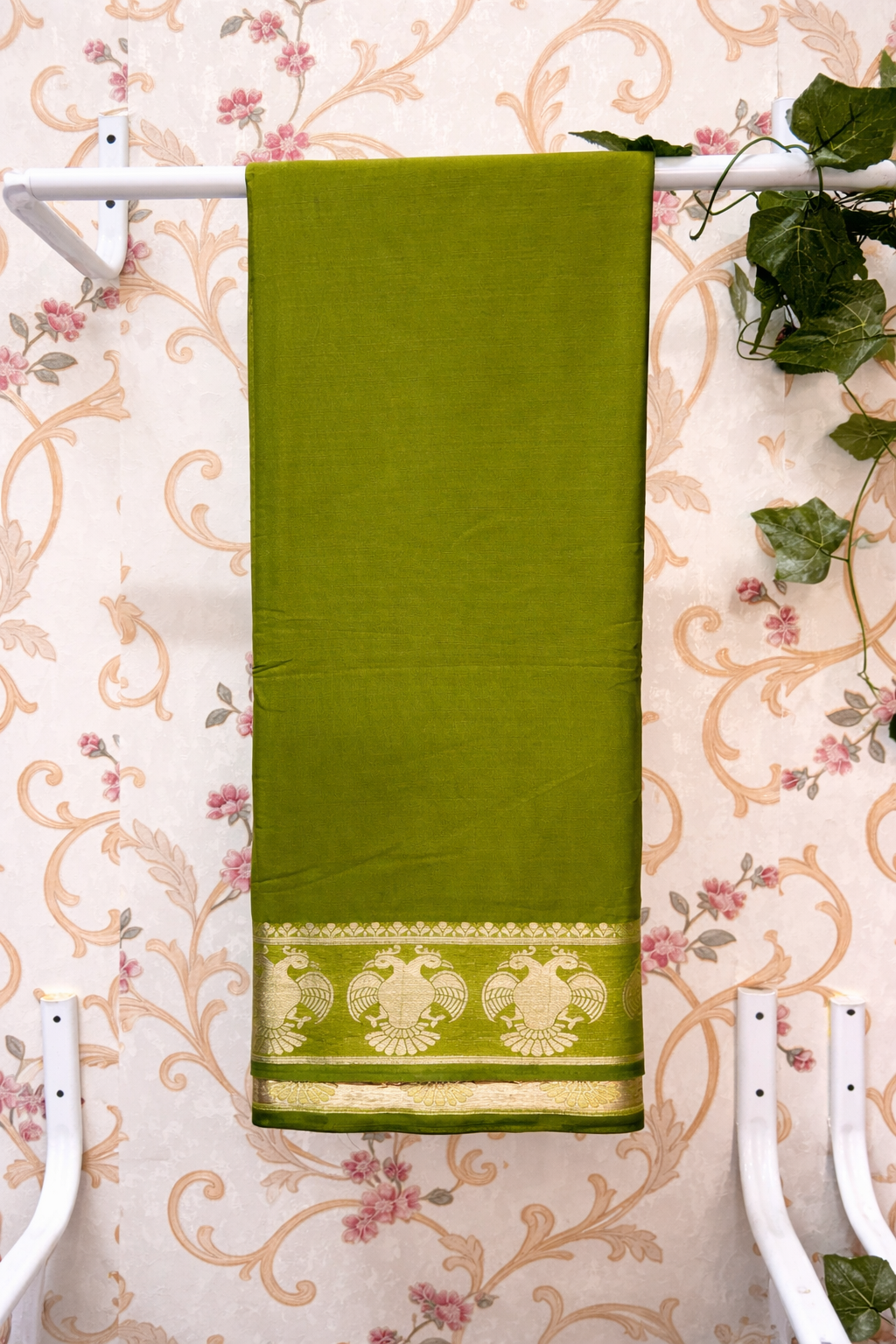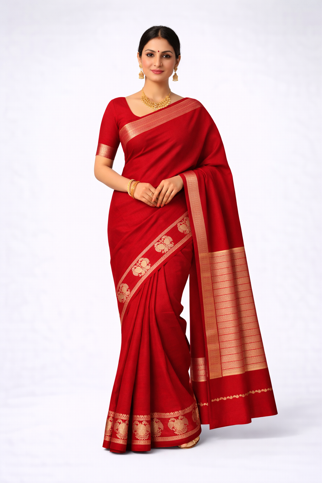 The saree features a subtle plain body that highlights its sophistication, complemented by a rich zari woven border with traditional motifs, adding a touch of heritage charm. Perfect for festive occasions, casual gatherings, or elegant day wear.