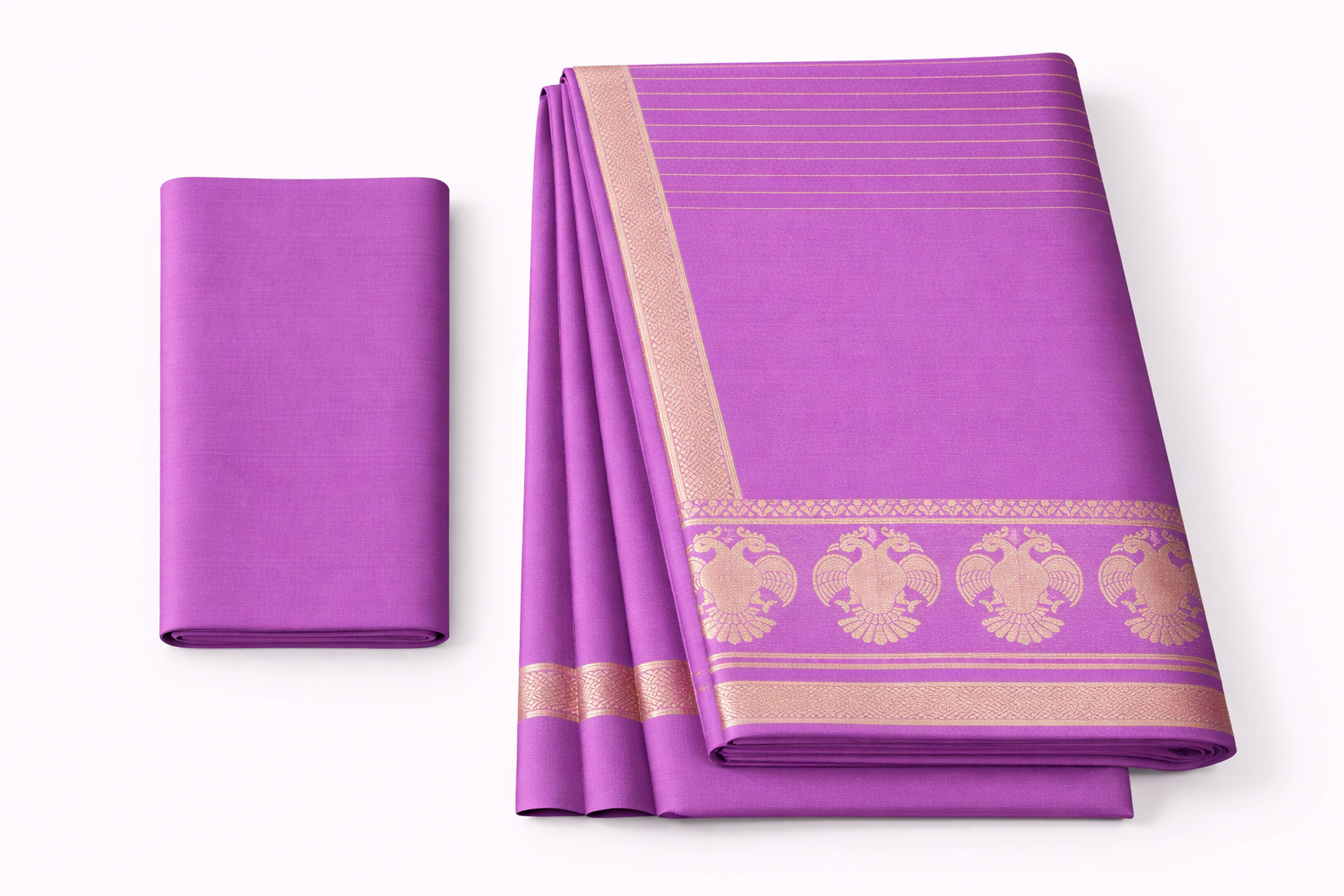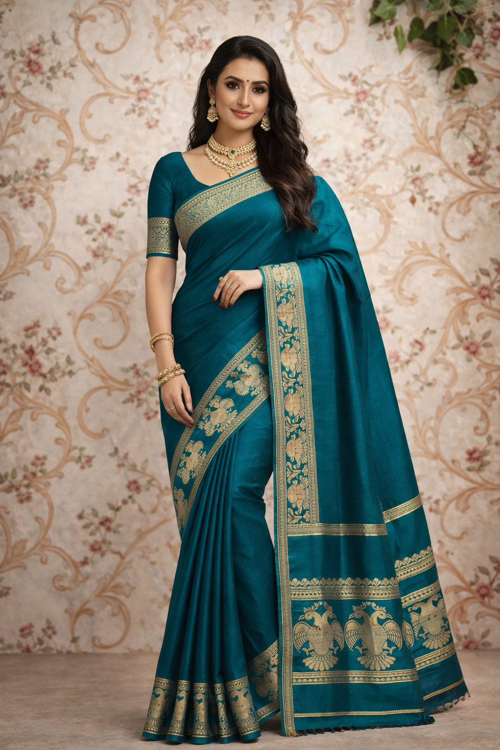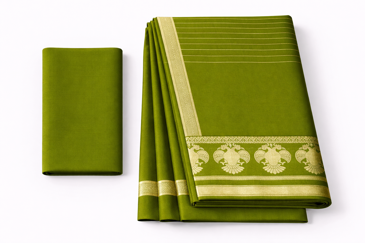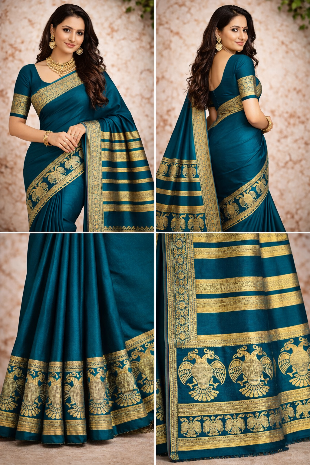 The saree features a subtle plain body that highlights its sophistication, complemented by a rich zari woven border with traditional motifs, adding a touch of heritage charm. Perfect for festive occasions, casual gatherings, or elegant day wear.