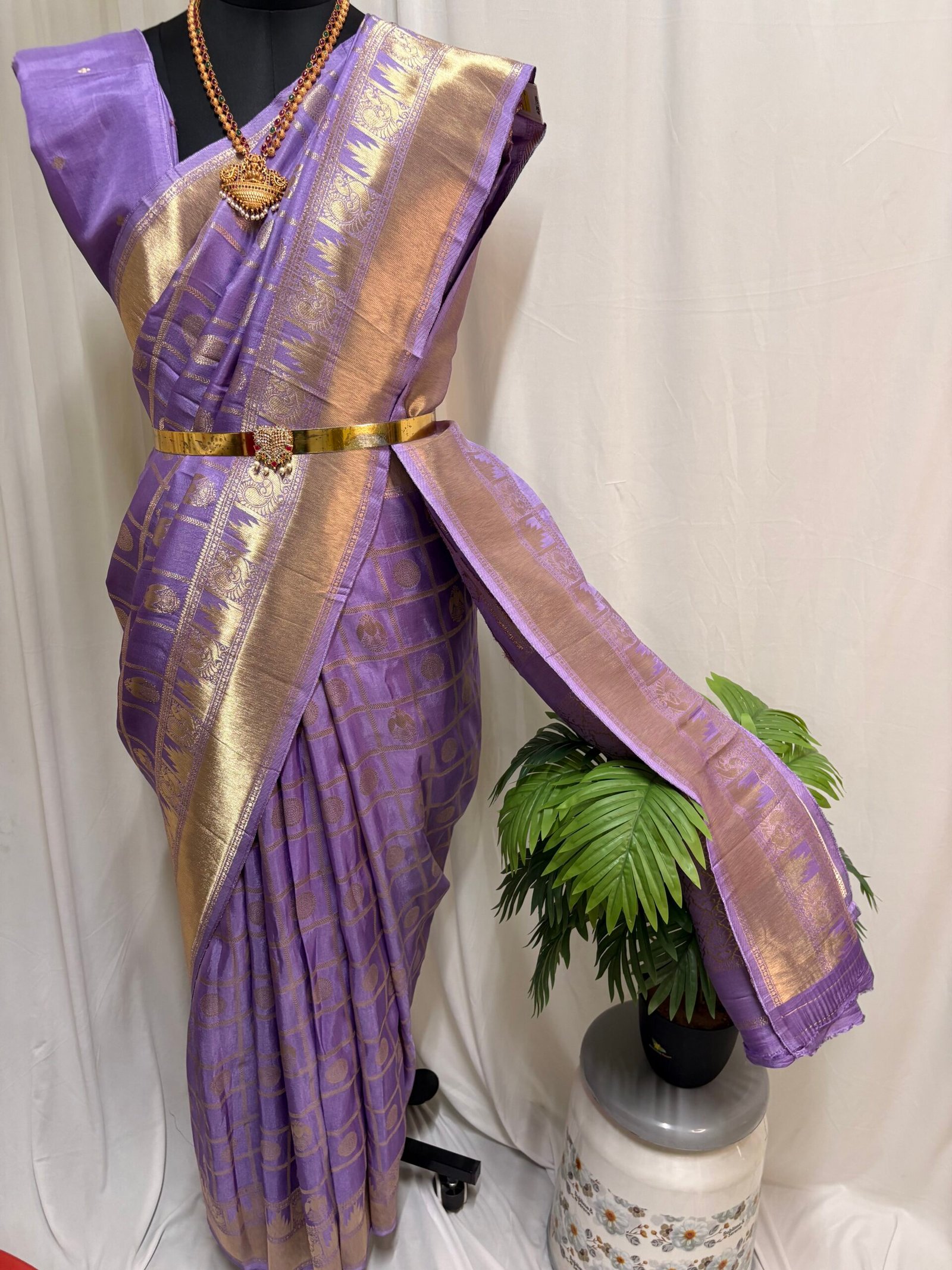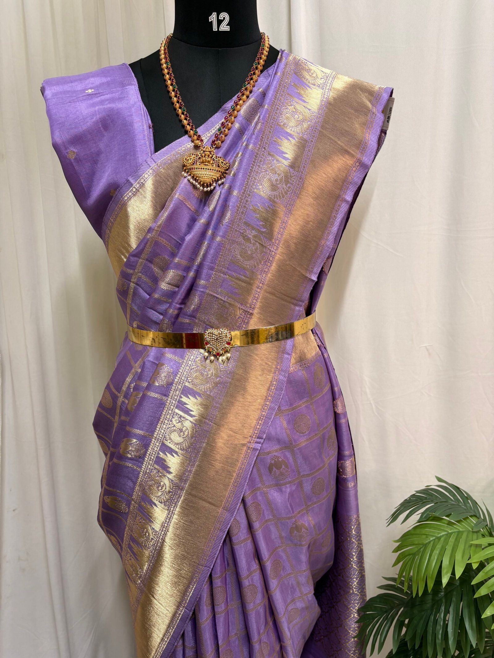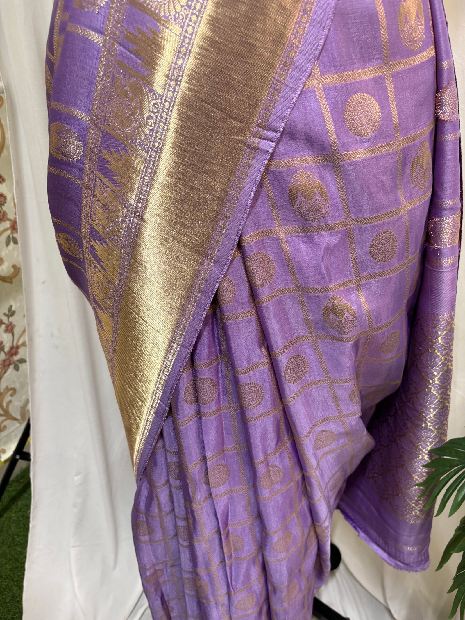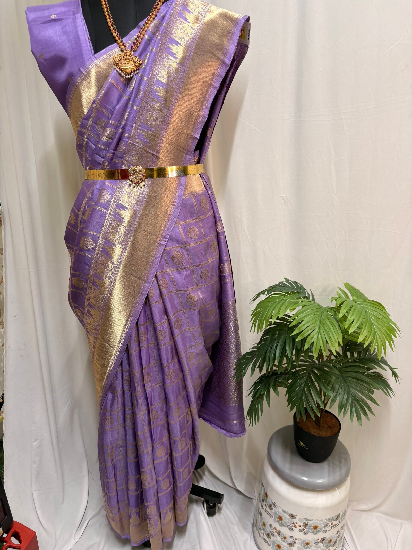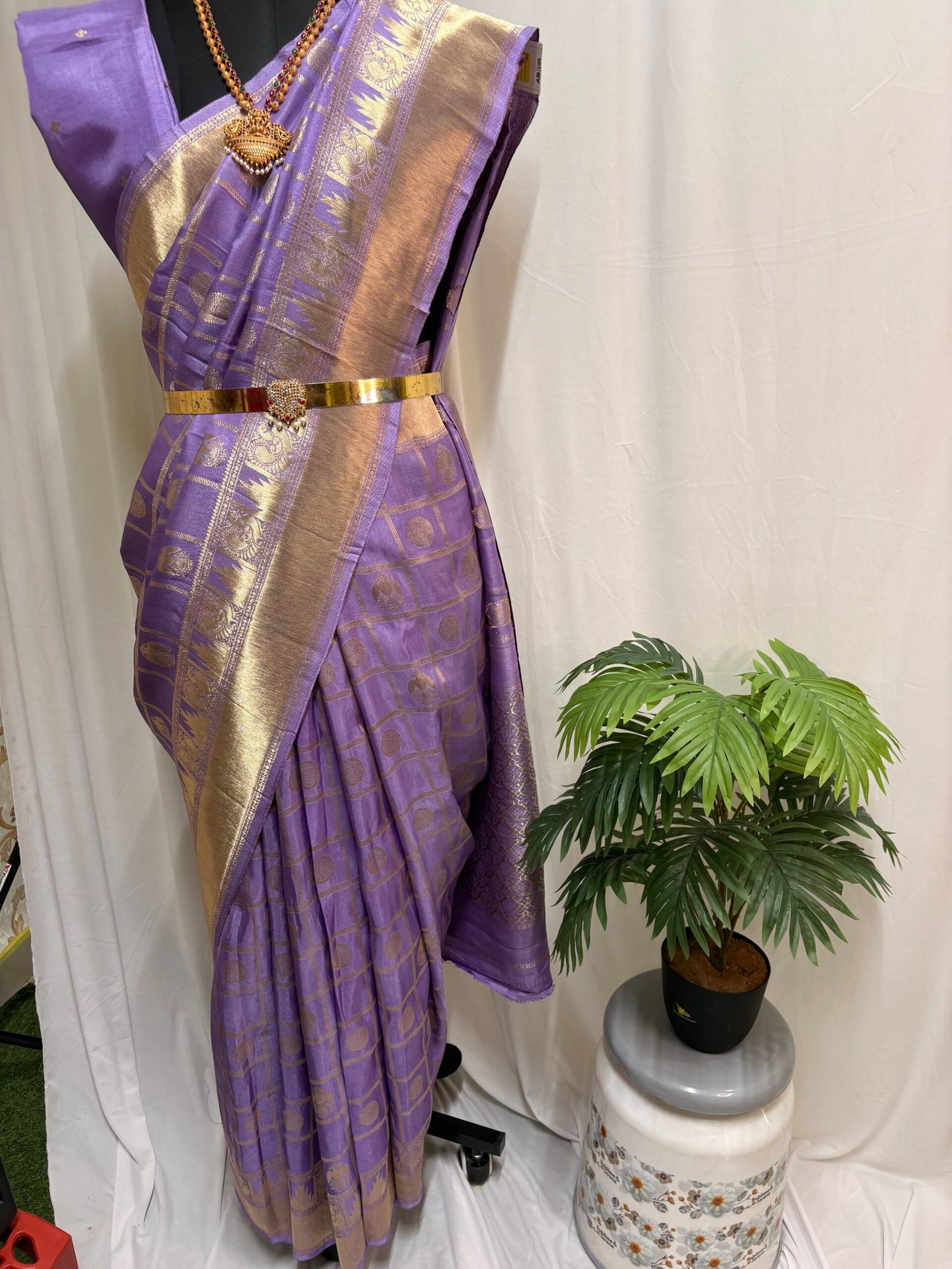 Draped in a deep maroon hue, this exquisite saree is a celebration of traditional elegance and timeless craftsmanship. The body features a refined grid (checks) pattern, thoughtfully adorned with delicate zari motifs that lend a structured yet graceful rhythm to the weave. Each motif sits with intention, creating a subtle interplay of geometry and heritage.