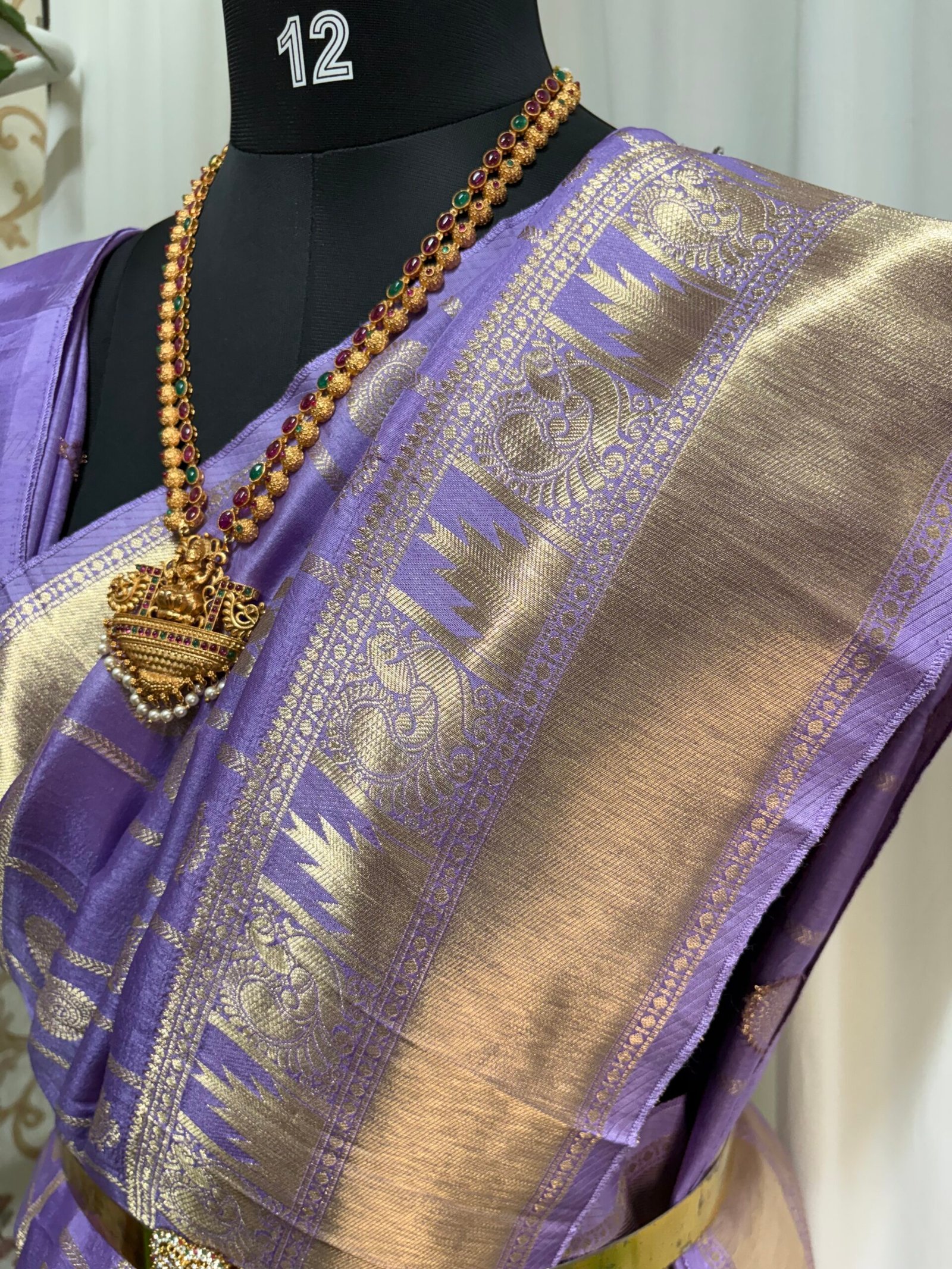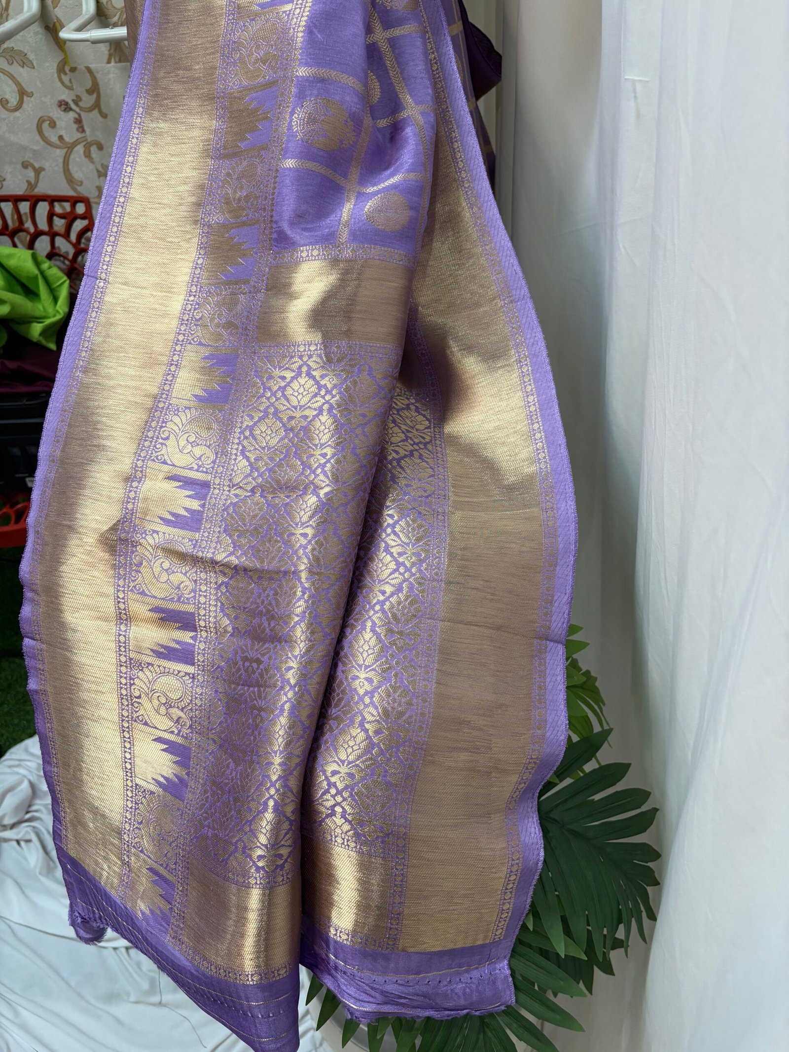 The highlight lies in its luxurious golden zari borders, broad and luminous, carrying intricate traditional patterns that evoke classic Banarasi artistry. The pallu continues this richness with detailed zari weaving, adding depth and grandeur when draped.